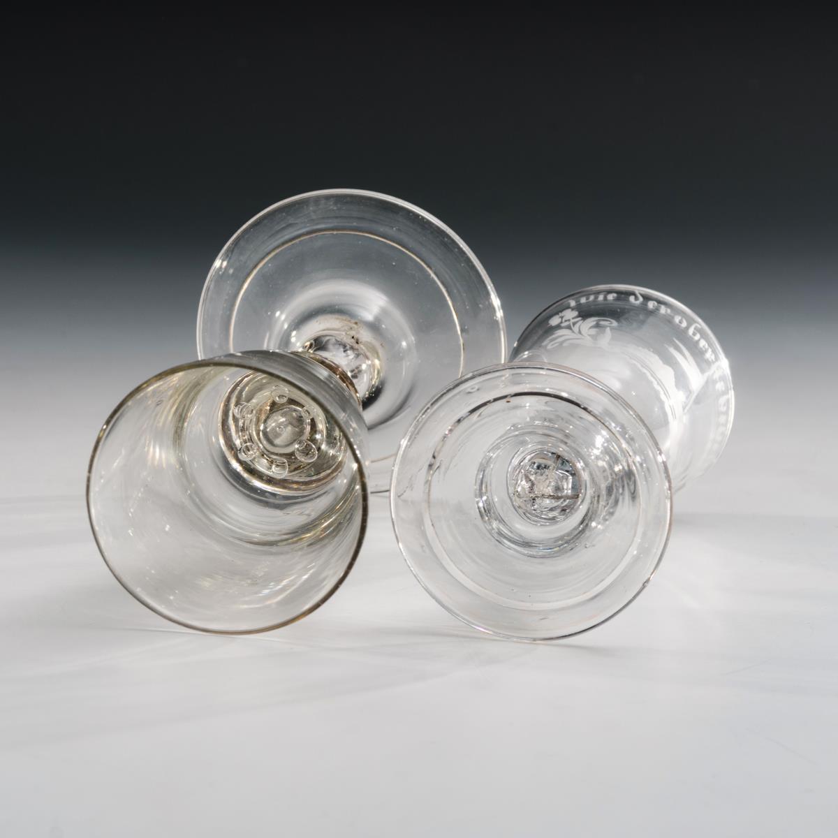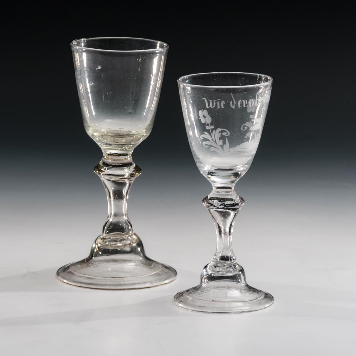 1x mit eingeschliffenem Luftblasenkranz am Kuppaboden, Hohlschaft und Rundfuß mit umgeschlagenem Rand. / 1x mit Schliffdekor und der Aufschrift "wie der oberste befielet.", Hohlbalusterschaft und Rundfuß mit umgeschlagenem Rand. Beide mit Abriss.