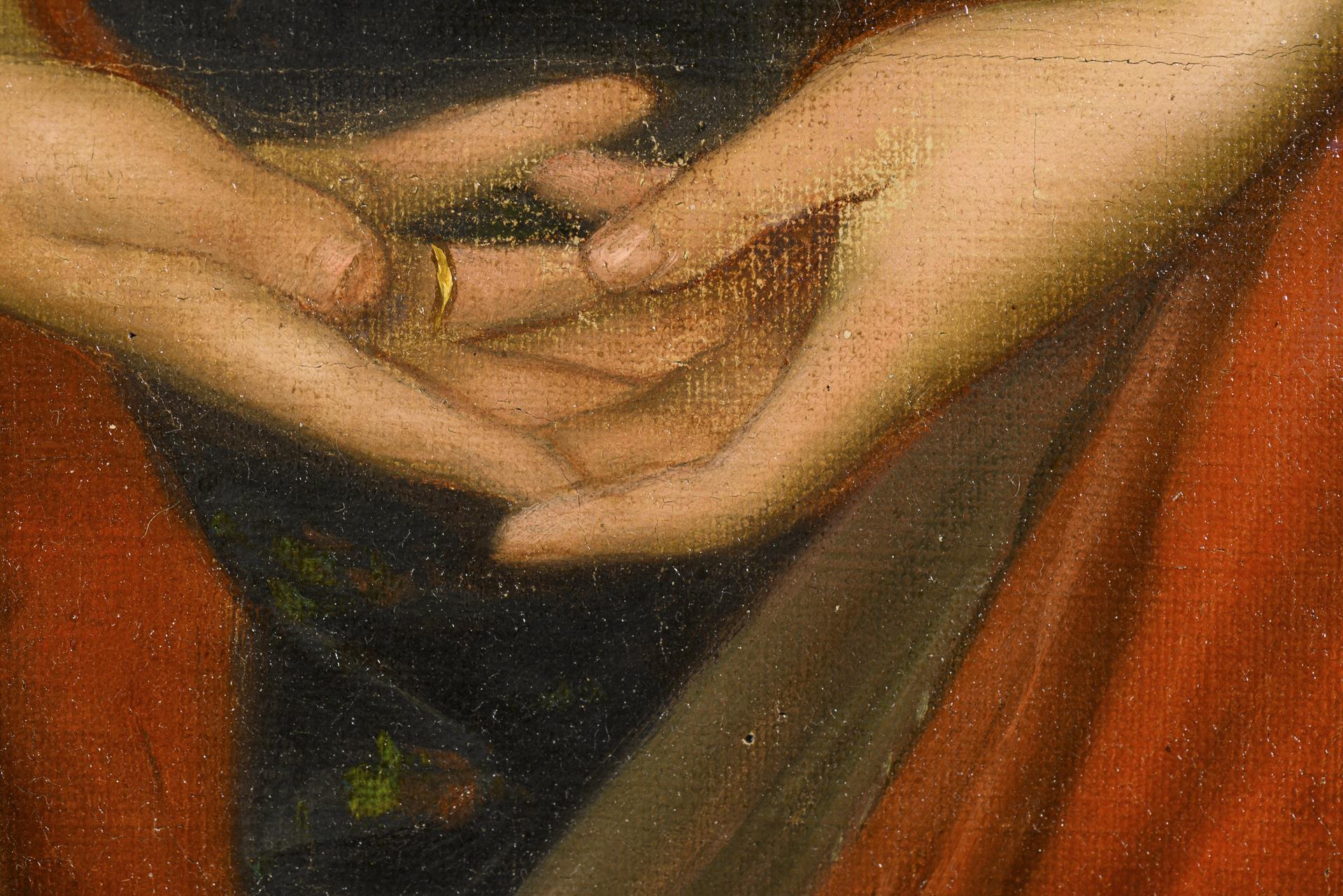 Porträt einer jungen Frau mit Obstkörben an einer Mauer mit Blick in die Bucht. Leinwand doubliert.