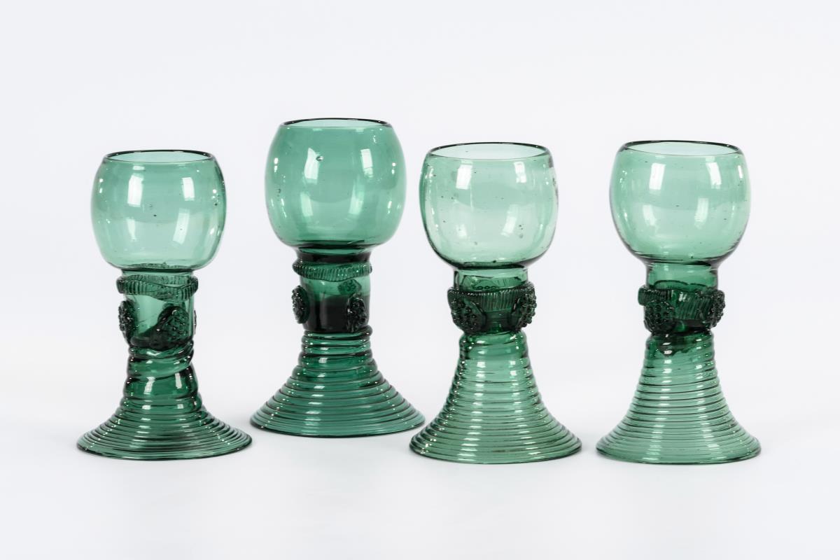 Bauchige Kuppa, Hohlschaft mit Zwackelband und Beerennuppen, gewickelter Trompetenfuß, Abriss.