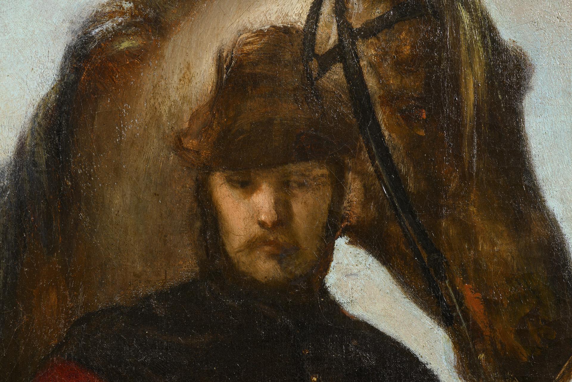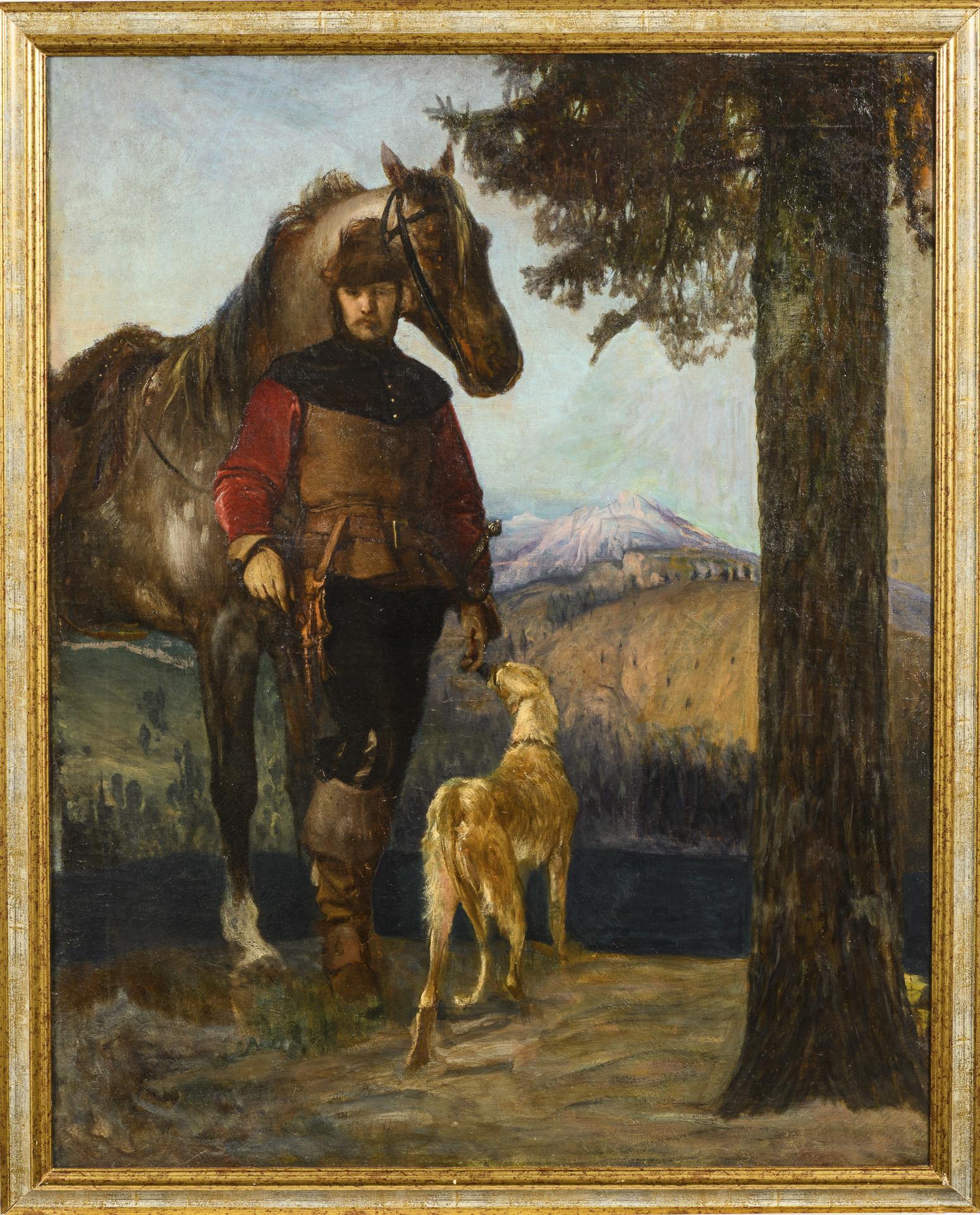 Jäger in historischer Kleidung, mit Blick über den See zu den Bergen unter blauem Himmel. Zwei kleine restaurierte Stellen.