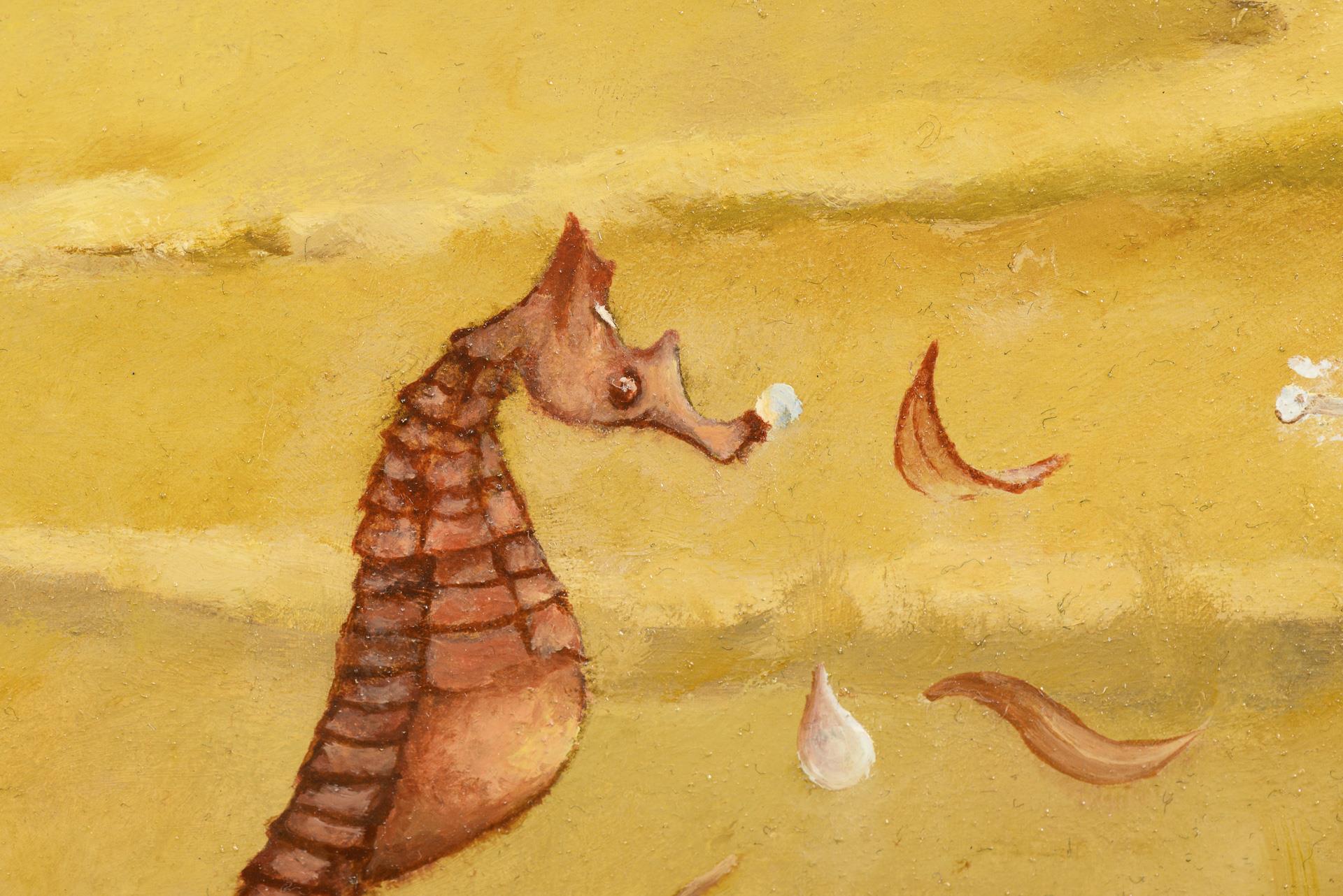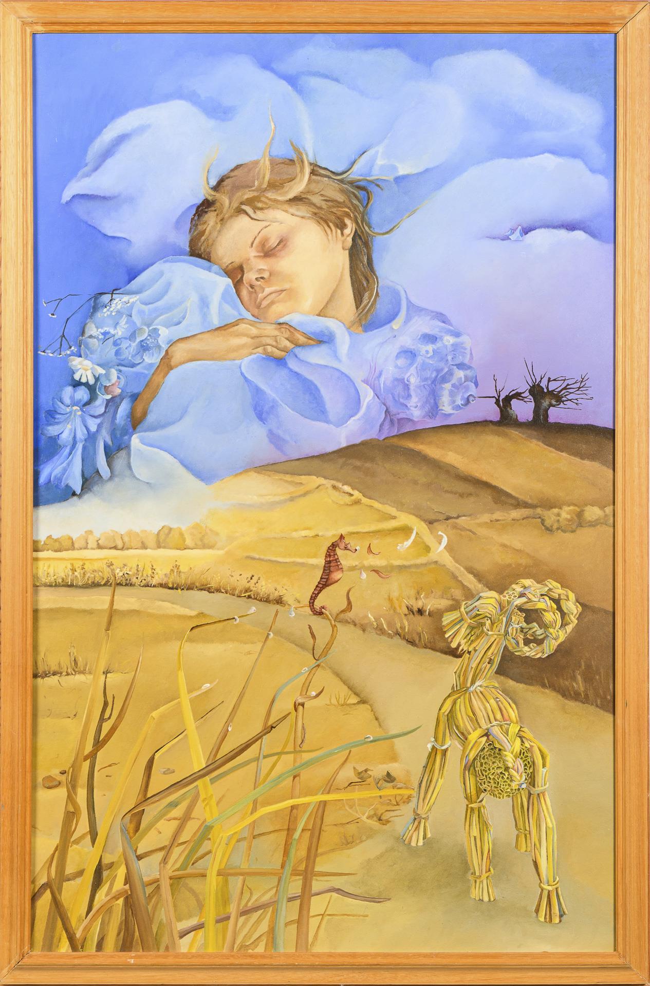 Surrealistische Traumlandschaft mit Seepferdchen und laufender Kornhockenpuppe und schlafendem Kind im Himmel.