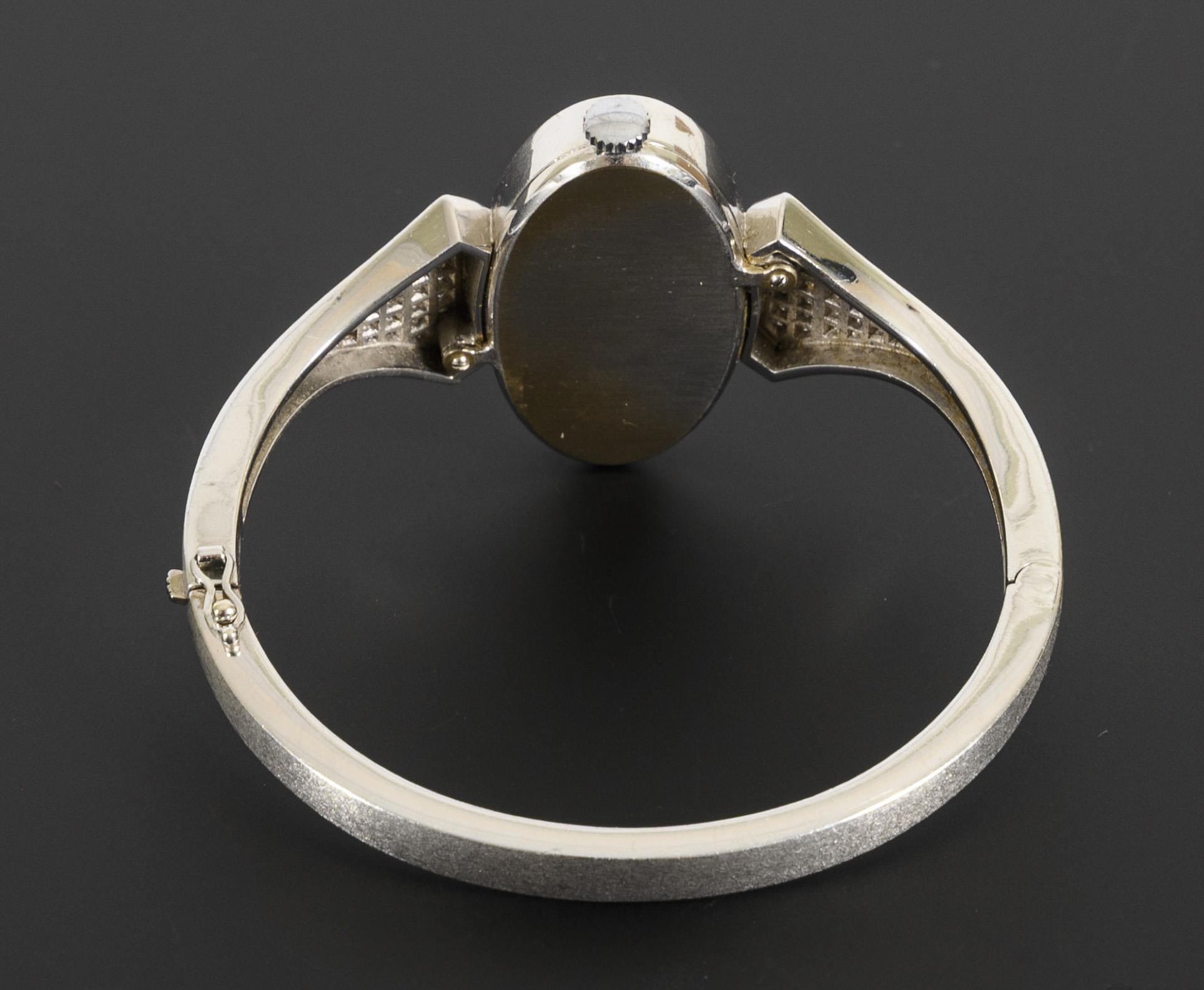 Damenarmbanduhr als Armspange mit einem ovalen, mit Achtkant-Diamanten besetzten Zifferblatt sowie brillantbesetzten Schultern.