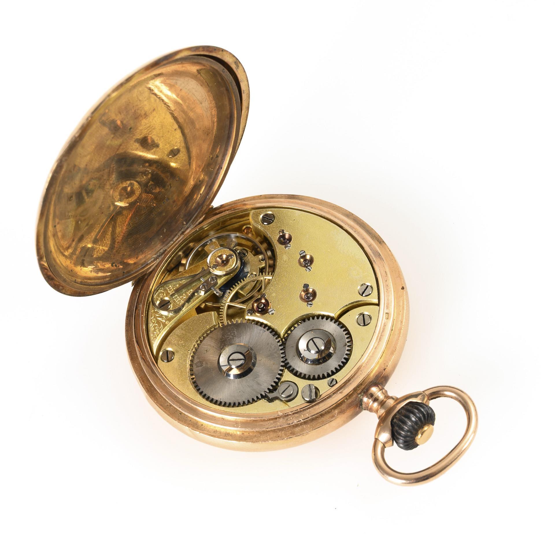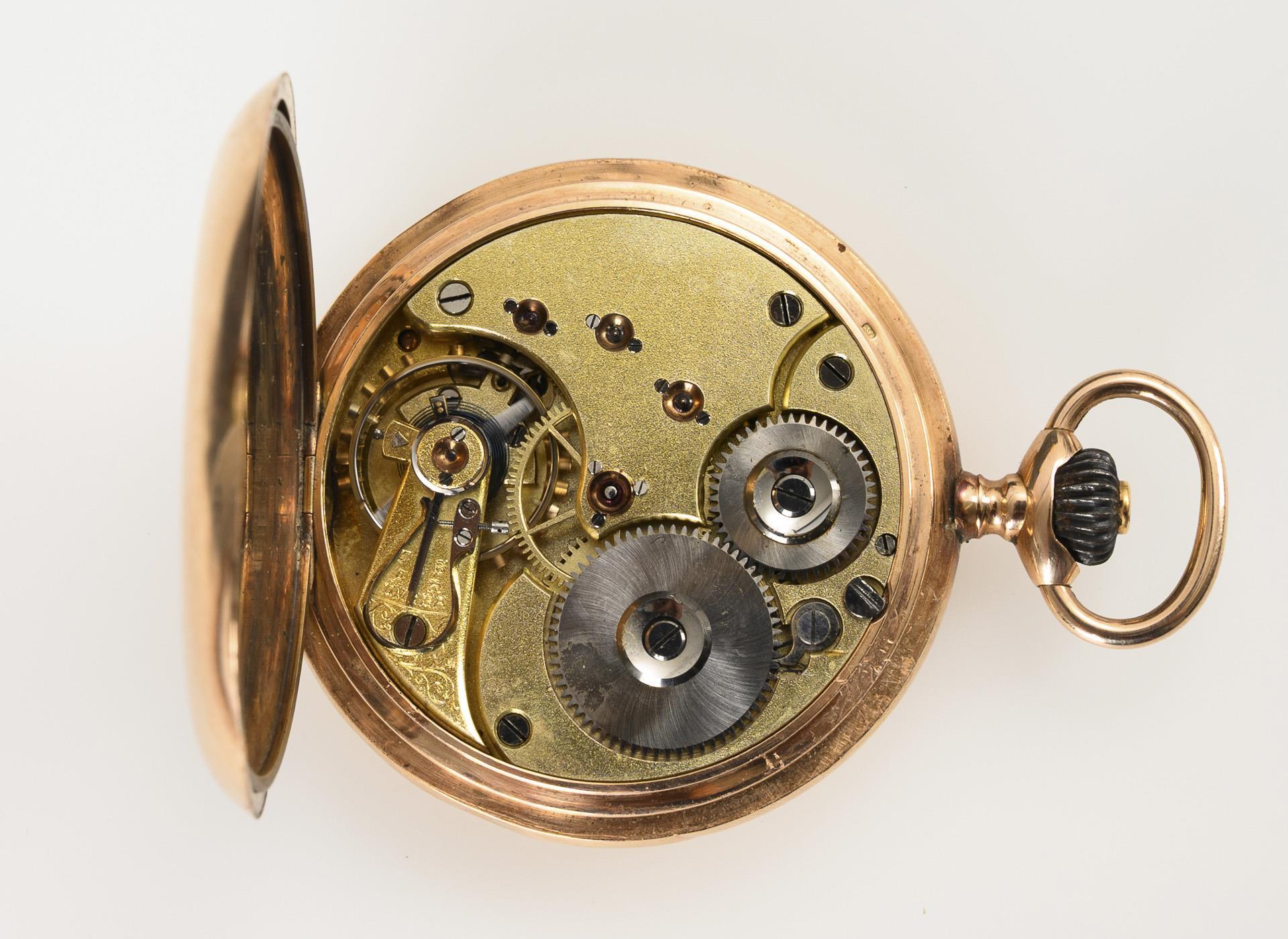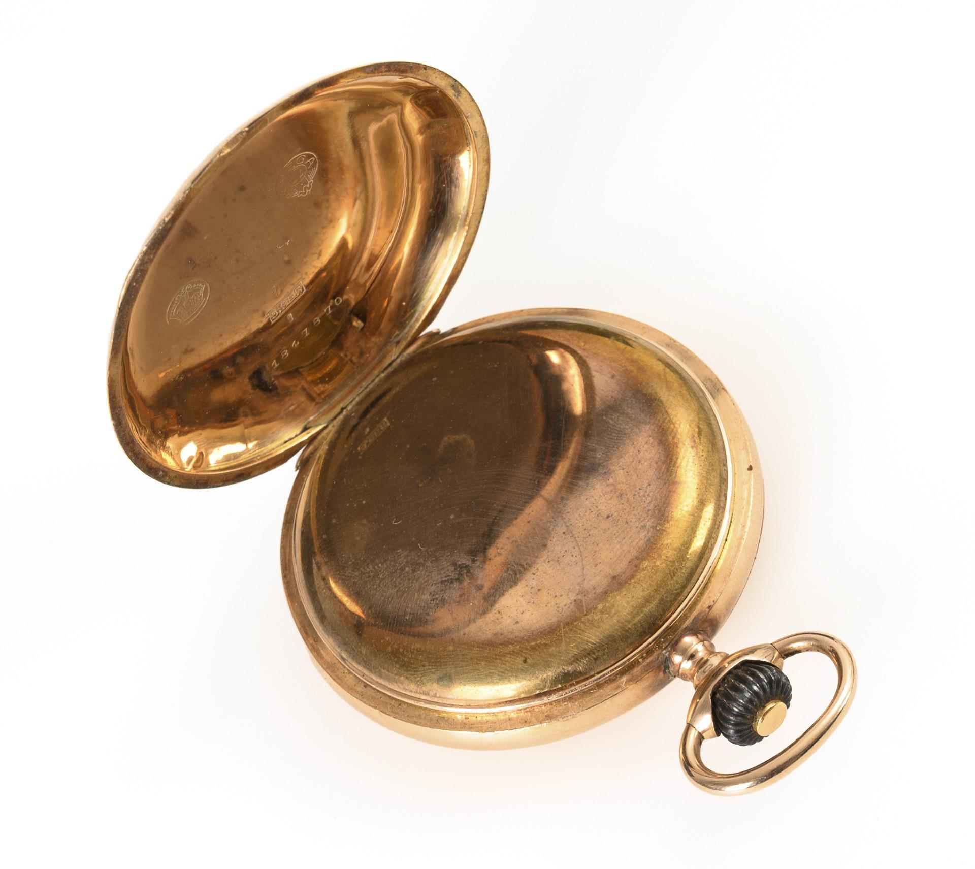 585 gepunzt, Schweizer Beschauzeichen, Feingehaltsstempel, Firmenmarke, Staubdeckel aus Metall. Ø 5 cm. 92 g.