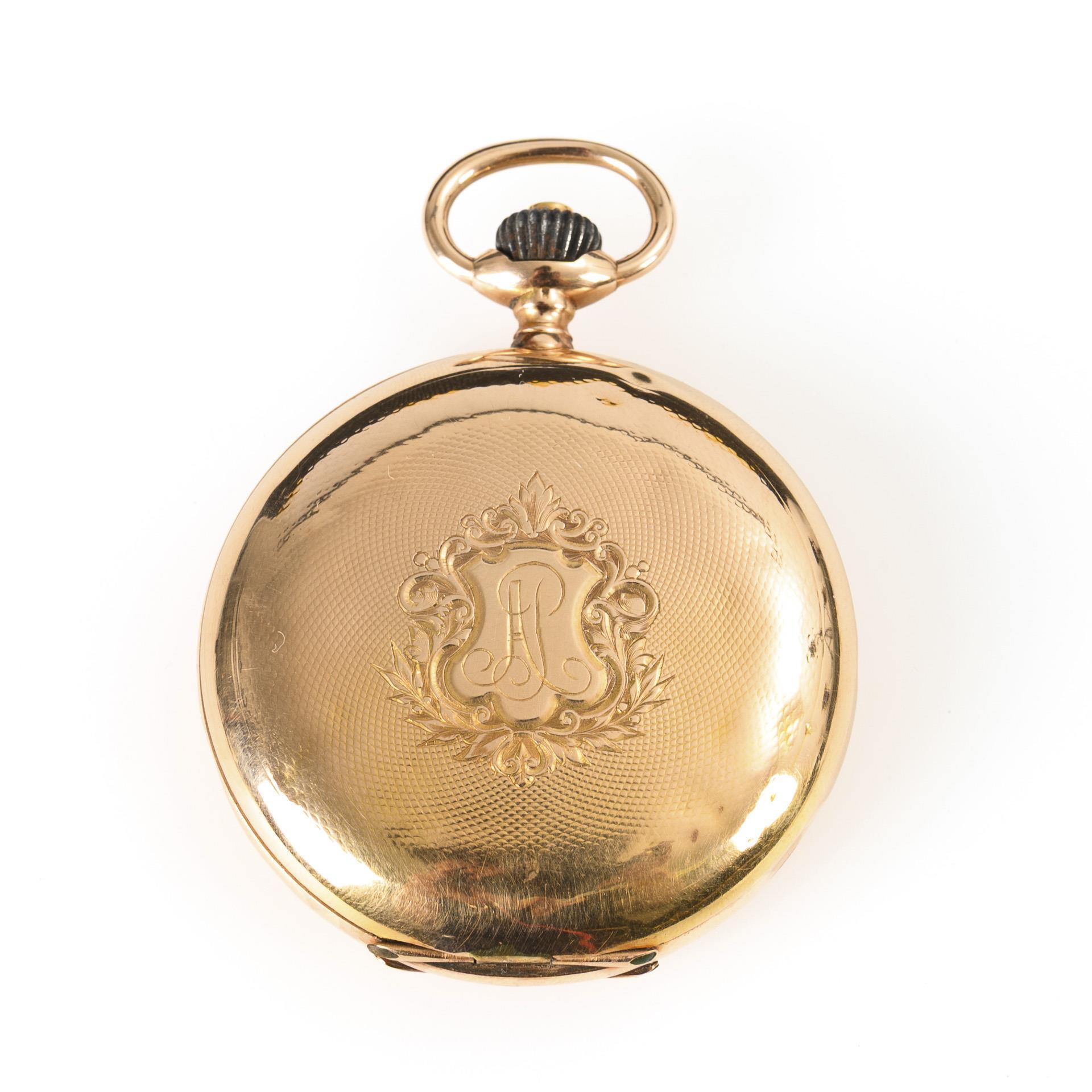 Guillochiertes Sprungdeckelgehäuse mit ligiert monogrammierter Wappenreserve. Gehäuse gedellt und berieben.