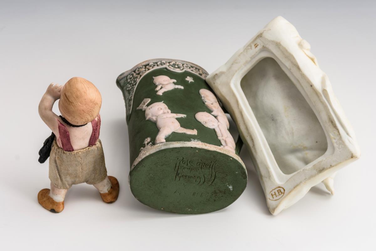 3x Kinderporzellan: Seltenes Kewpie-Kännchen, Kinderfigur und Baby auf Kissen. Wohl teils Heubach.