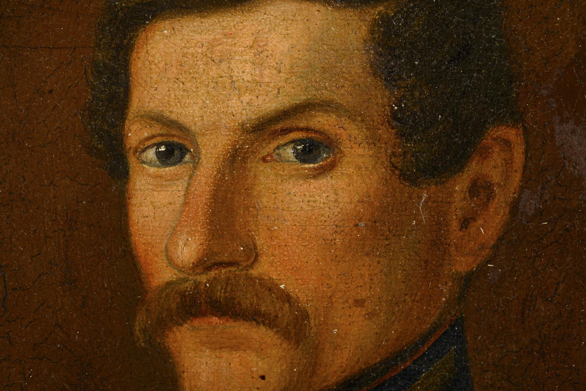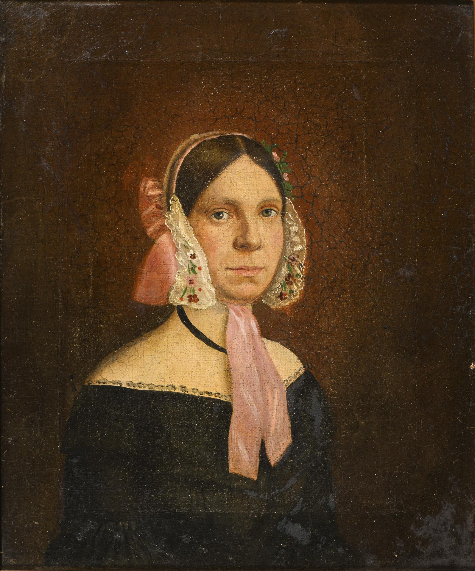 Porträt einer jungen Frau im schwarzen Kleid mit geblümter Haube sowie eines Mannes in grüner Uniform. Altersspuren.