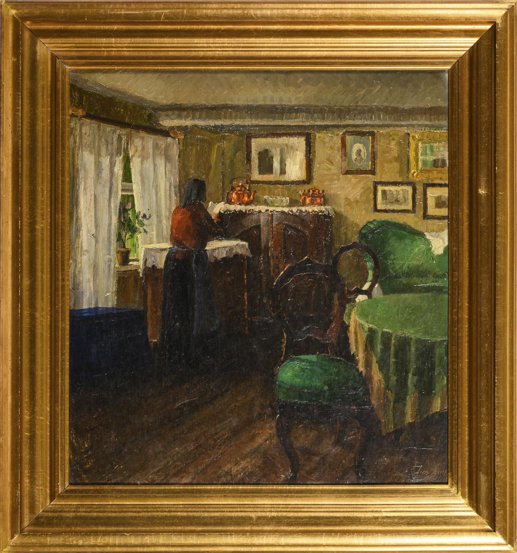 Bürgerliches Interieur mit schönen Sitzmöbeln und Kommoden sowie Bildern an den Wänden.