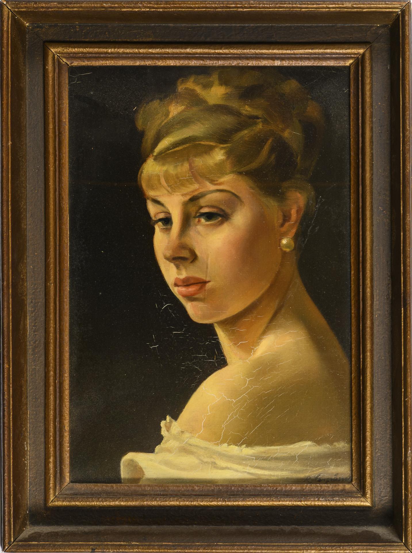 Porträt einer jungen Frau mit hochgestecktem Haar vor dunklem Hintergrund. Leichte Altersspuren.