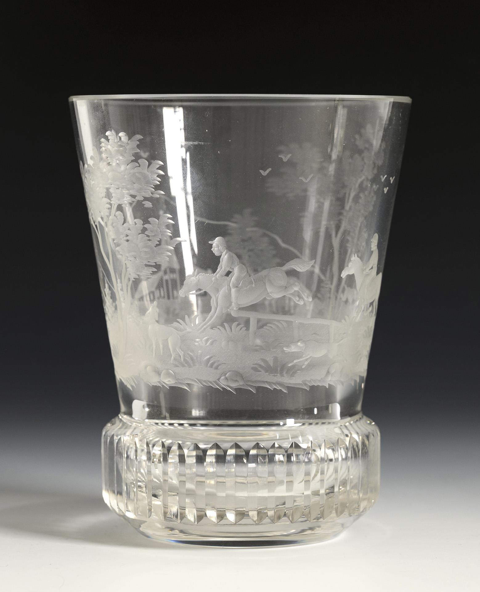 1x 19. Jh.: Kelchglas mit facettiertem Schaft und der geschnittenen Darstellung einer Landschaftsinsel mit Hirsch und Hund (H 12,5 cm). /2x 20. Jh.: 1x facettiertes Kelchglas mit der Darstellung zweier Hunde in einer Waldlandschaft und 1x Ranftbecher mit der umlaufend geschnittenen Darstellung einer Landschaft mit Jagdreitern, Hunden, Schafen und Pferd (H 17 und 12,5 cm). 1x Fußrand und minimal Rand bestoßen.