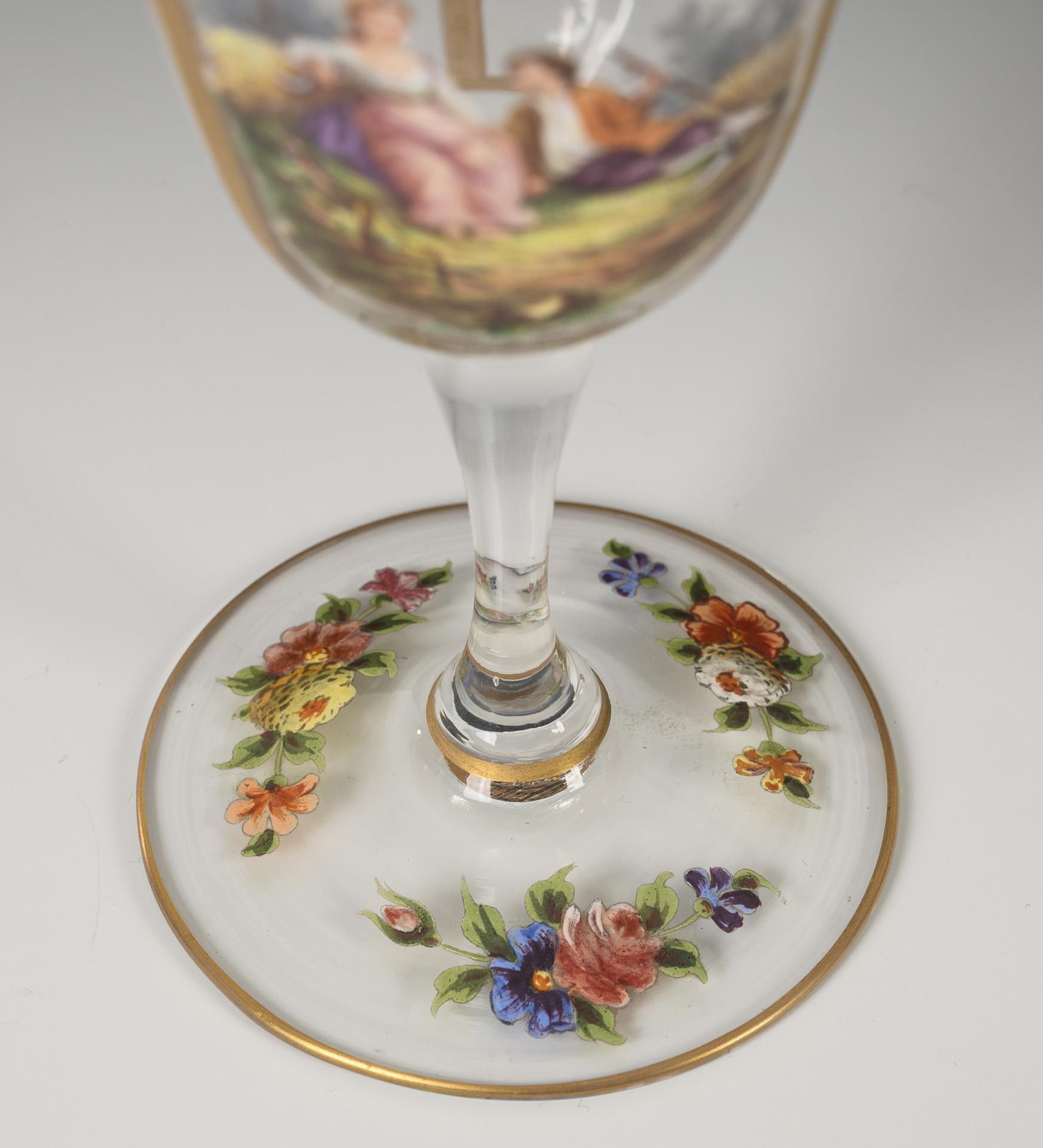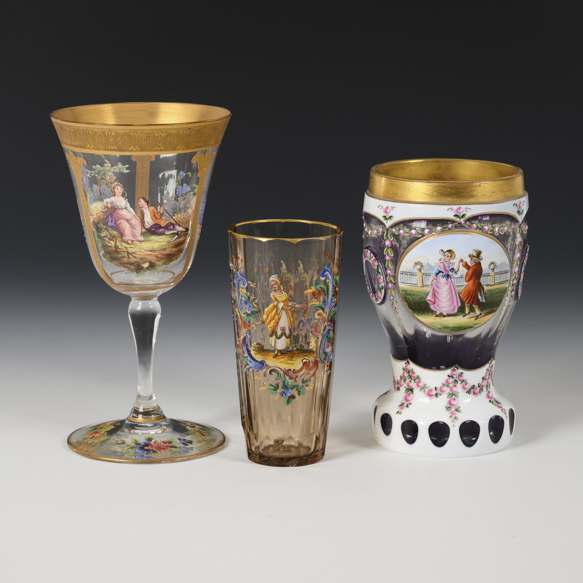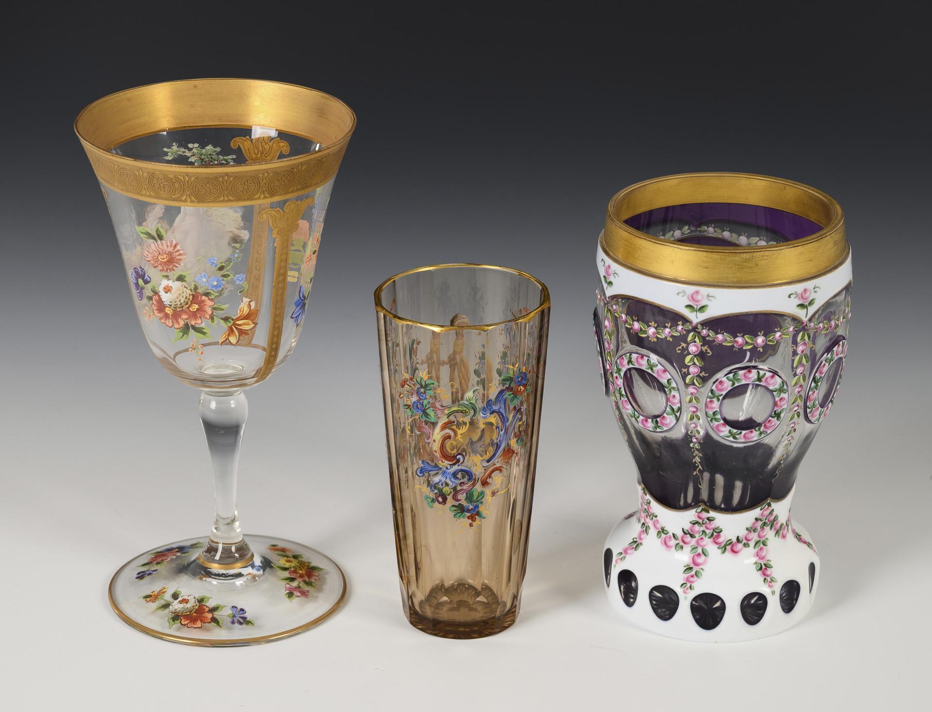 1x um 1850: Fußbecher aus farblosem Glas mit violettem und weißem Überfang, Facettenschliff und hochgeschliffenen Medaillons, diese teils als Linsen gearbeitet. Rosengirlanden in Reliefemail, schauseitig ein großes Medaillon mit der Darstellung eines im Garten tanzenden Biedermeier-Paares, auf dem weißen Überfang gemalte Röschen und Rosengirlanden (H 13,5 cm). / 1x Kelchglas aus farblosem Glas mit vergoldeter Ätzbordüre, schauseitiger Watteau-Malerei und Blumenmalerei (H 16 cm). / 1x zwölffach facettierter Becher aus bräunlichem Glas mit der Darstellung einer Rokokodame zwischen Rocaillen und Blüten (H 11 cm).
