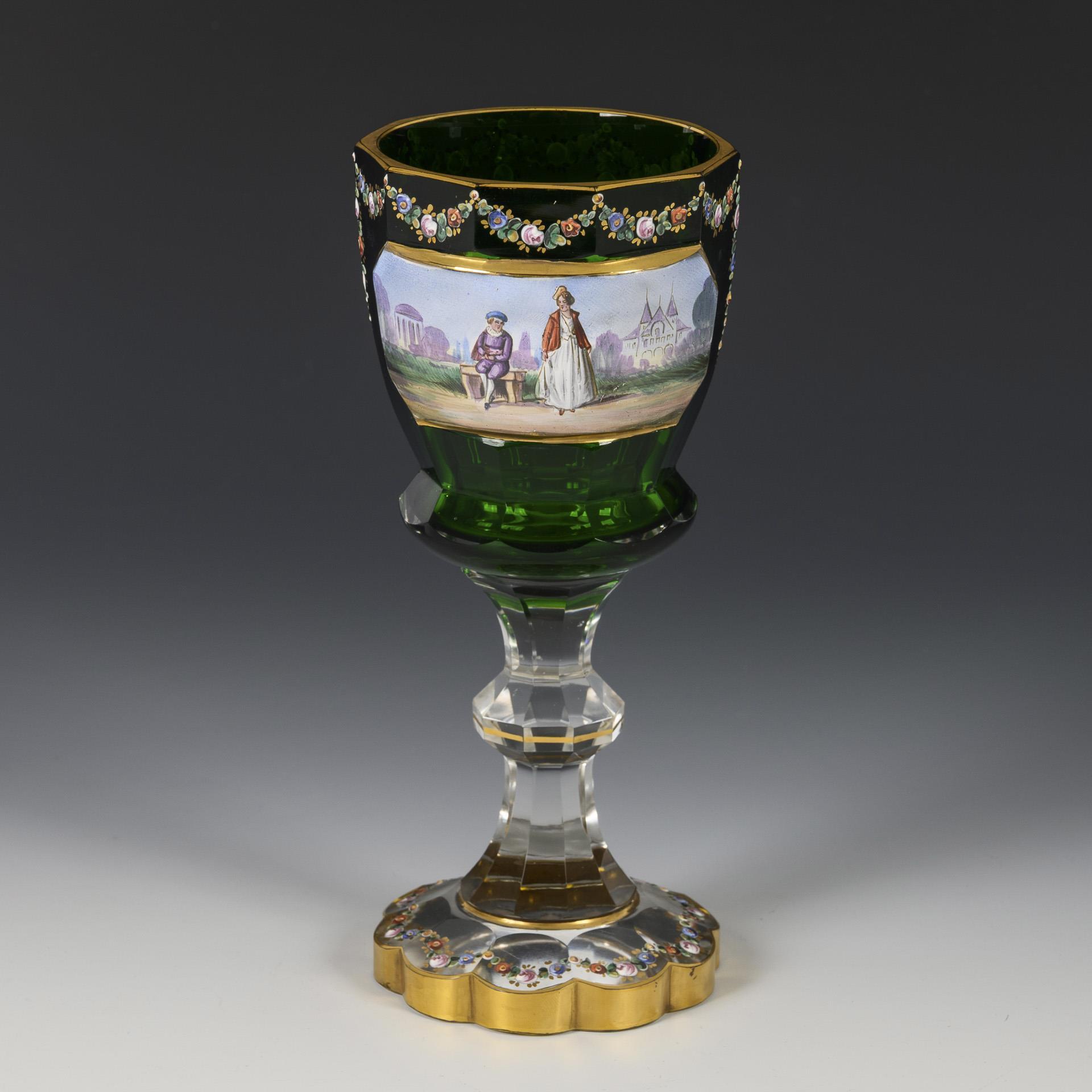 Zehnfach facettierte Glockenkuppa aus farblosem Glas mit grünem Innenfang, nodierter Schaft und mehrpassiger Fuß; plan geschliffener Boden. Schauseitig eine hochgeschliffene Rechteckkartusche mit der Darstellung eines Watteaupaares in einer Parklandschaft mit Schloss und Tempel, am Rand eine feine Blumenbordüre in Reliefemail.