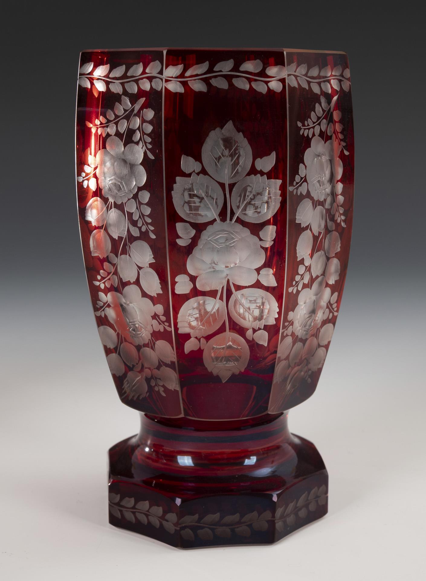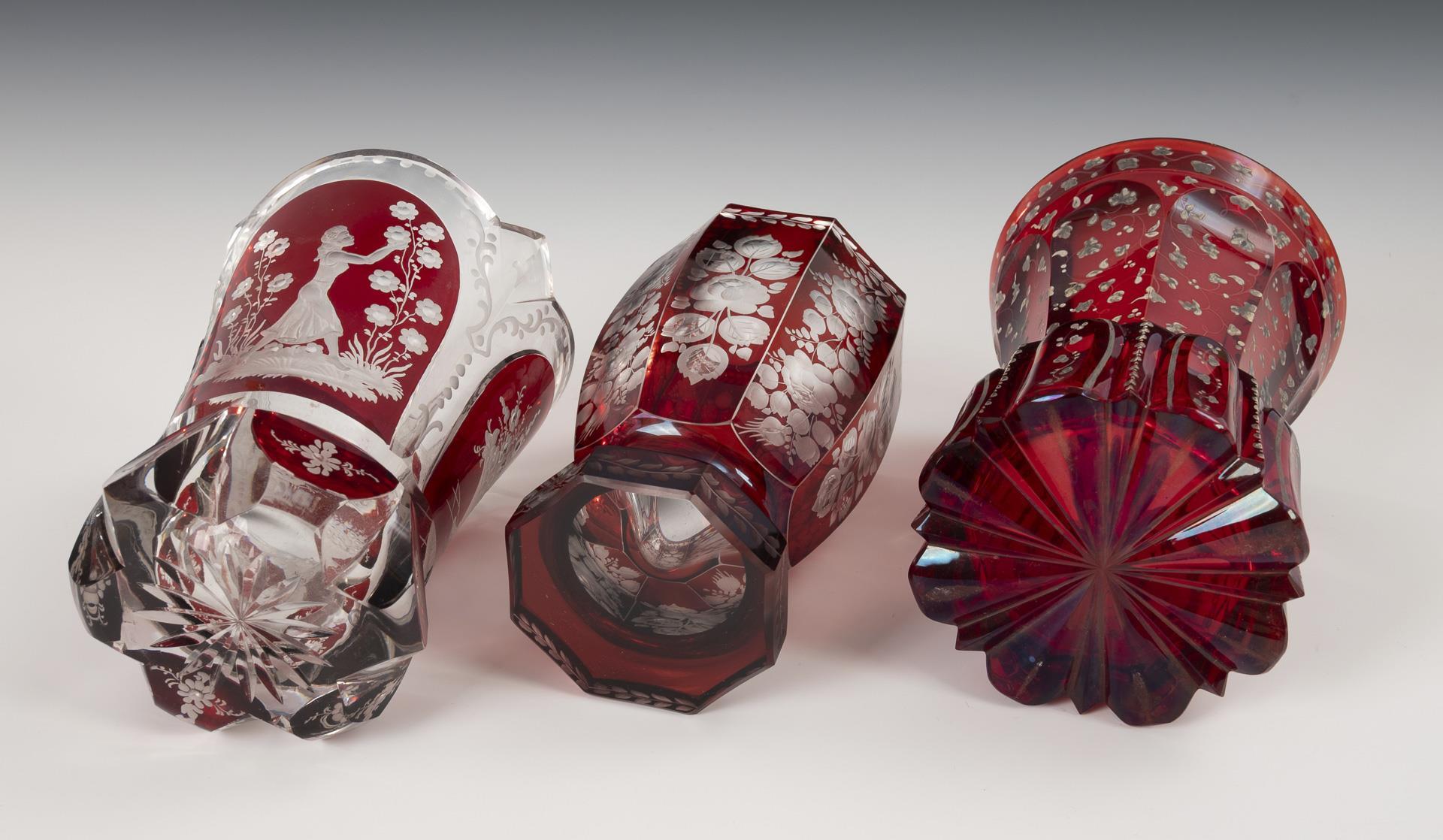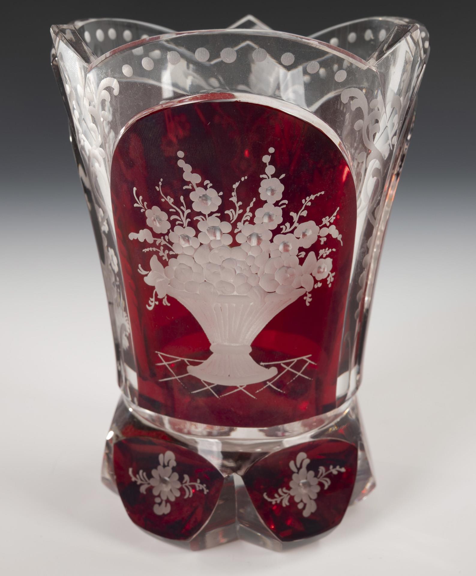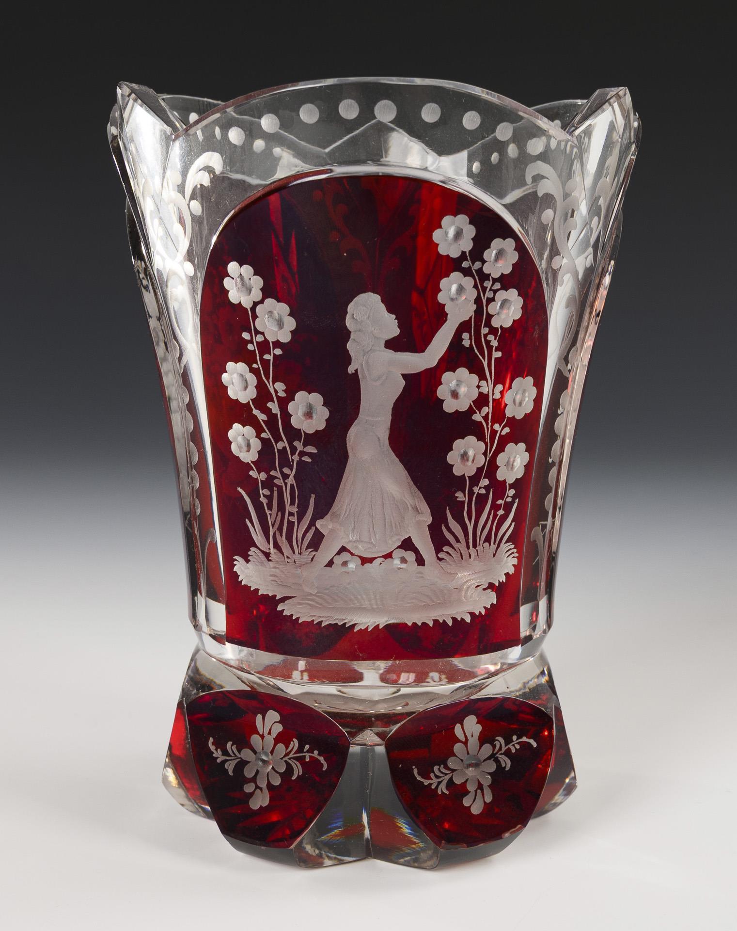 Farbloses, rot gebeiztes Glas. H 13-13,5 cm.