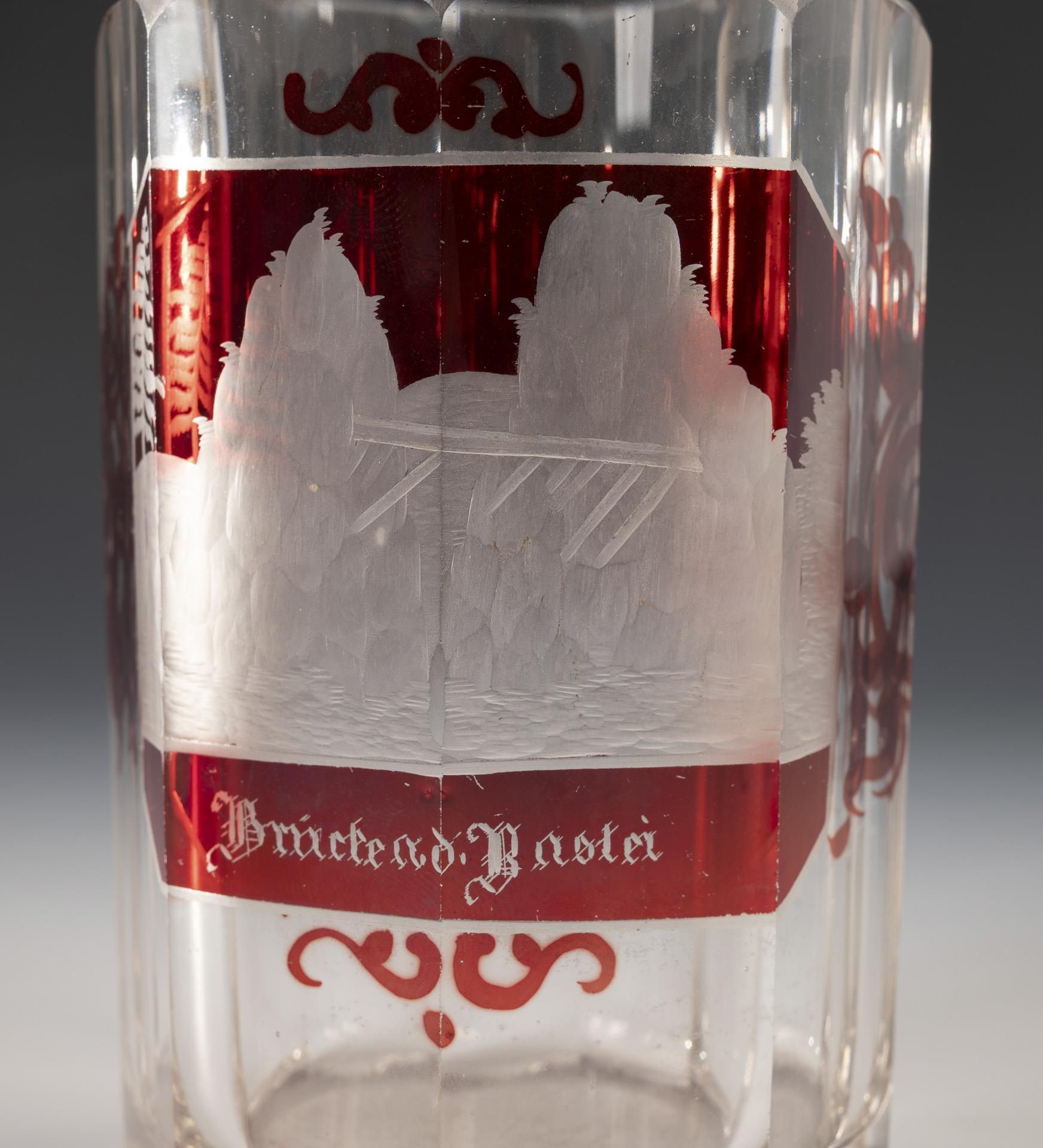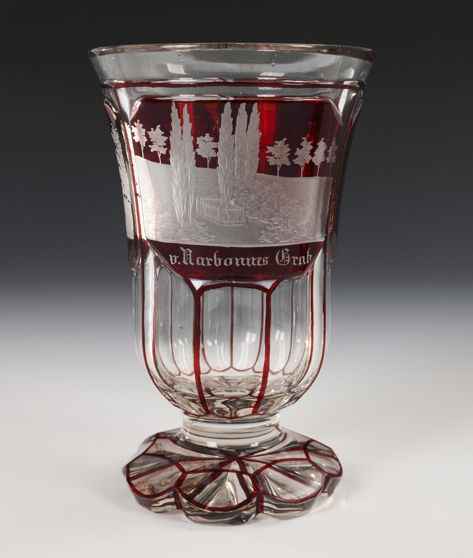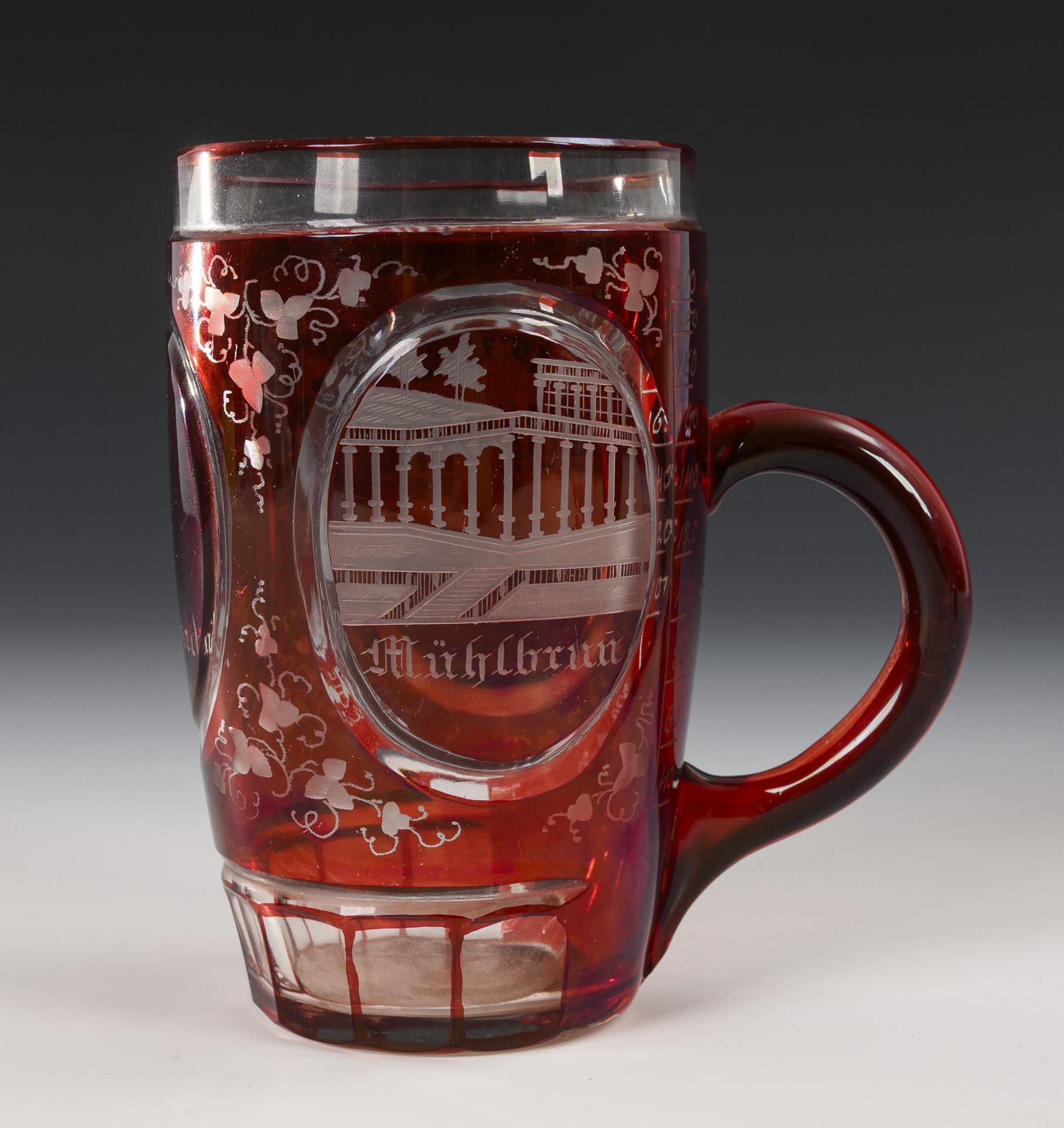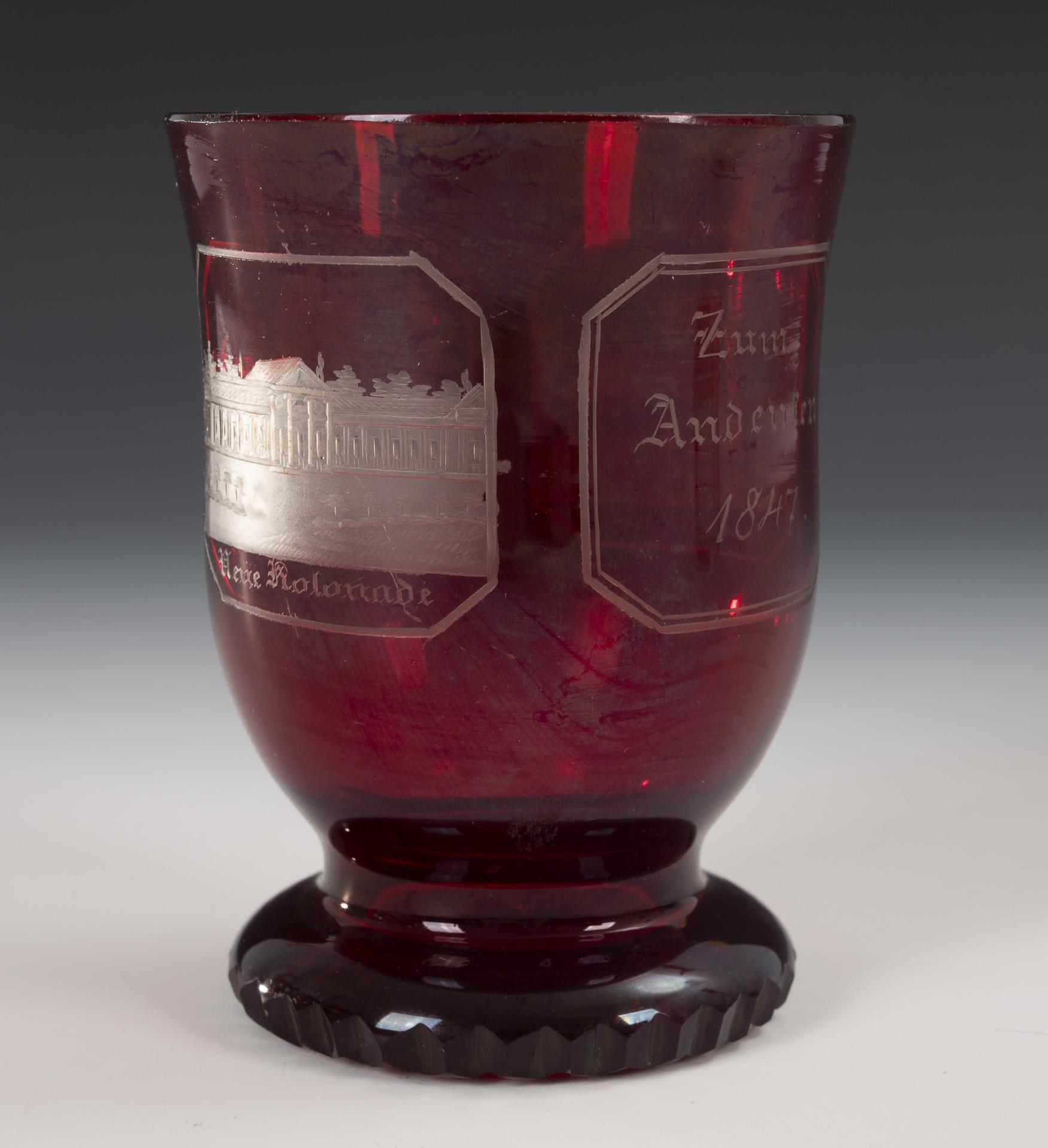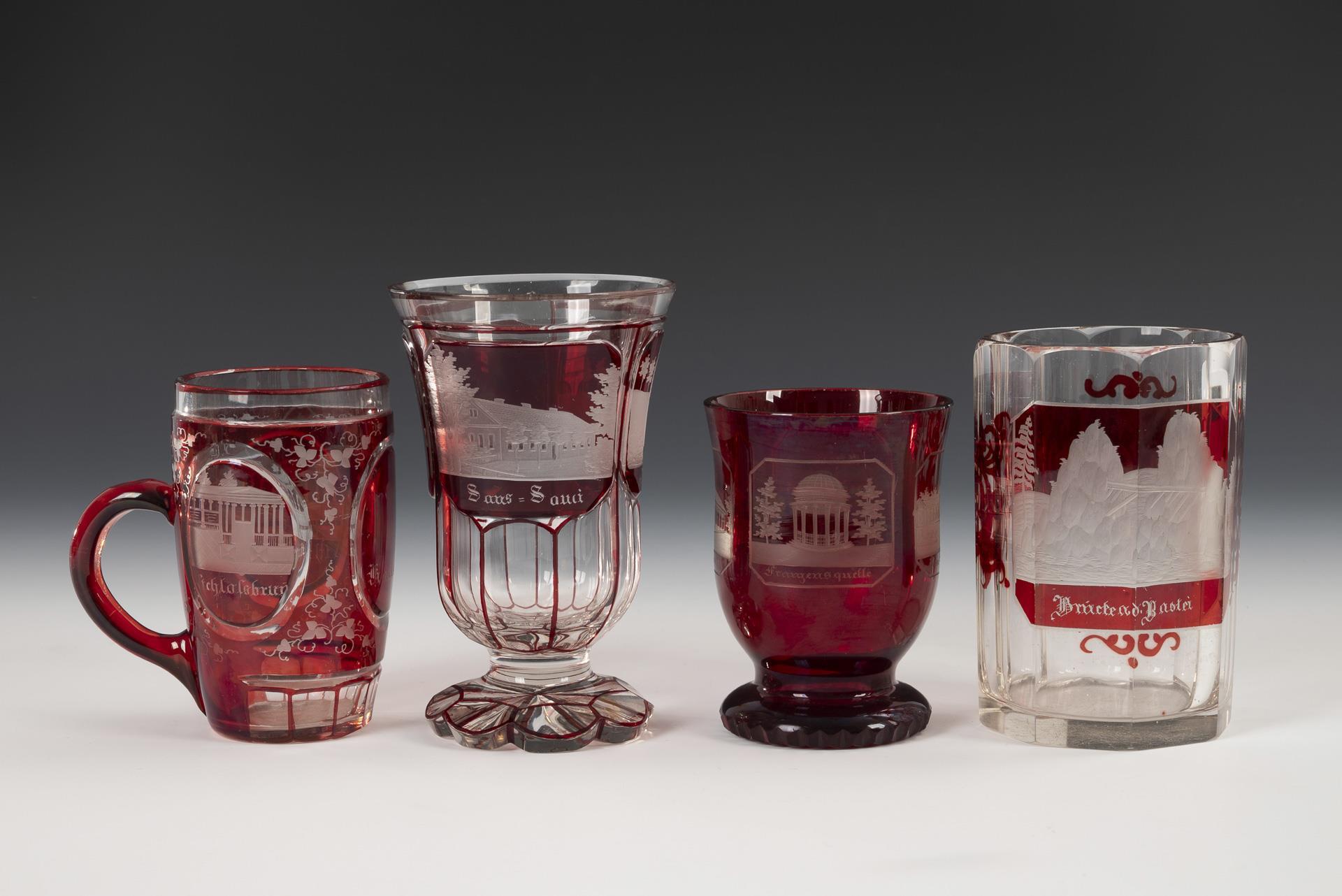1 facettierter Becher, 1 Henkelbecher und 2 Fußgläser mit gravierten Ansichten (u.a. Sächsische Schweiz, Karlsbad). Becher mit 2 minimalen Randbestoßungen.