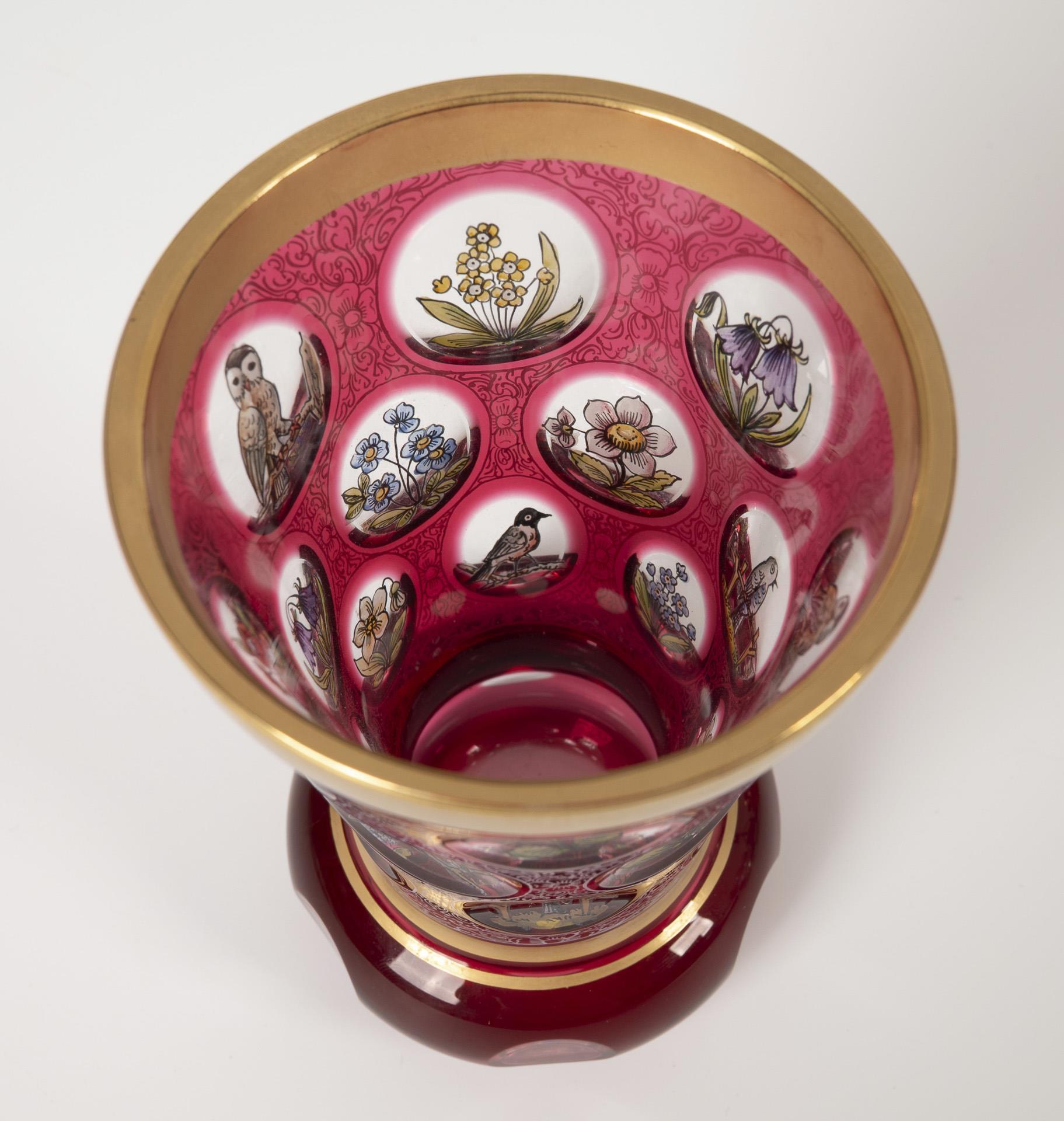 5 verschiedene Fußbecher: 3x mit floraler Gravur, 1x mit blauem Überfang, Facettierung und Würmelband, 1x mit Emailmalerei in geschliffenen Linsen. 1x Gold berieben.
