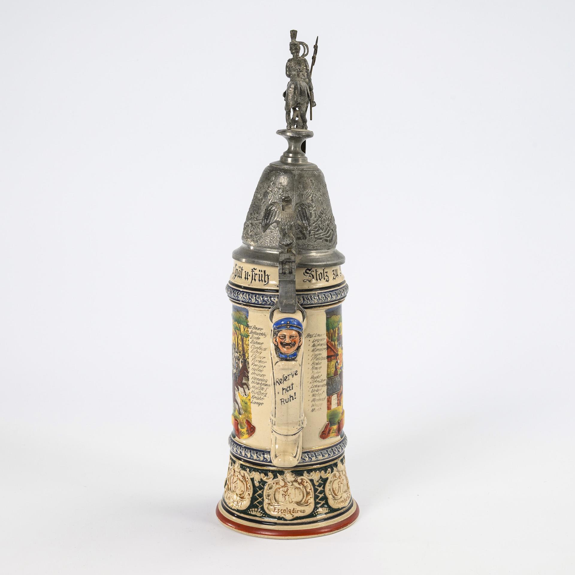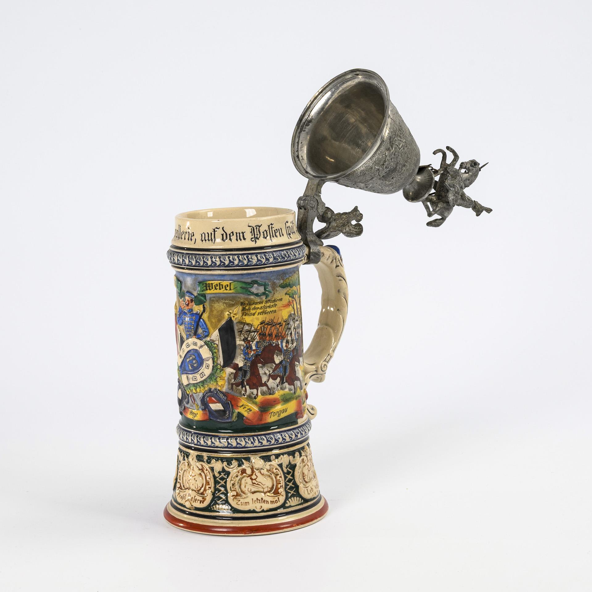 Reich reliefierter Krug mit Husar über zentralem Hufeisen mit Regimentsnr. "12" sowie soldatische Szenen mit Sprüchen. "Reservist Webel", "2. Esk. Thür. Hus. Rgt. No. 12 Torgau". Hoher Zinndeckel mit Reliefszenen und Adlerdrücker sowie Husar zu Pferd mit Lanze. In den Pferdeaugen Stanhope-Lupenminiatur, unter dem Pferd abgehängte Fahne ursprünglich mit Malerei. Scharnieranguss gelockert, Namensleiste etwas berieben, Stanhope-Mikrofotografie fehlt, Fahnenbemalung defekt.