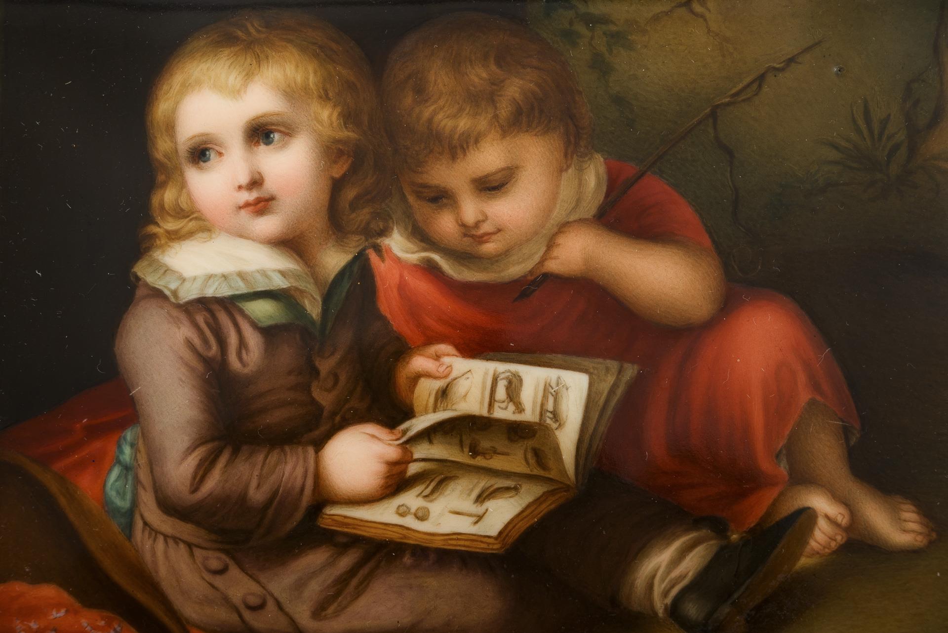Rechteckige Platte mit der Darstellung zwei Knaben, sich ein Bilderbuch anschauend, nach einem Gemälde von Christian Leberecht Vogel (1759-1816), welches die beiden Söhne des Künstlers darstellt.