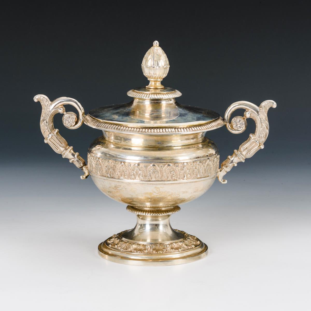Im Stil des Klassizismus, mit reliefierten Blattfriesen und eingerollten Henkeln. Deckel mit Zapfenknauf. Lötstellen am Fuß.