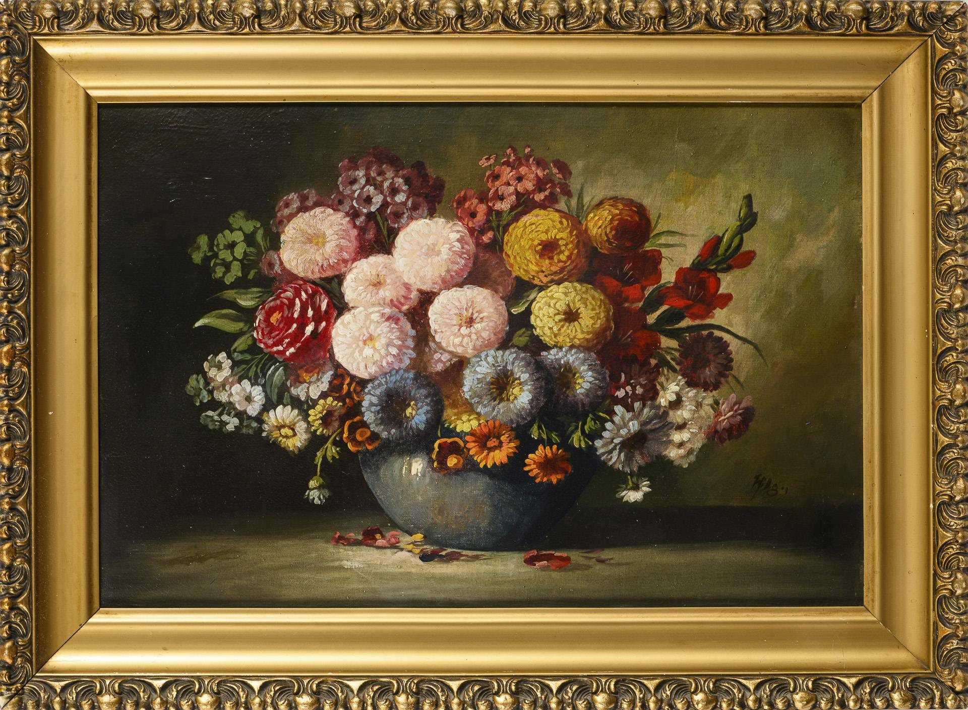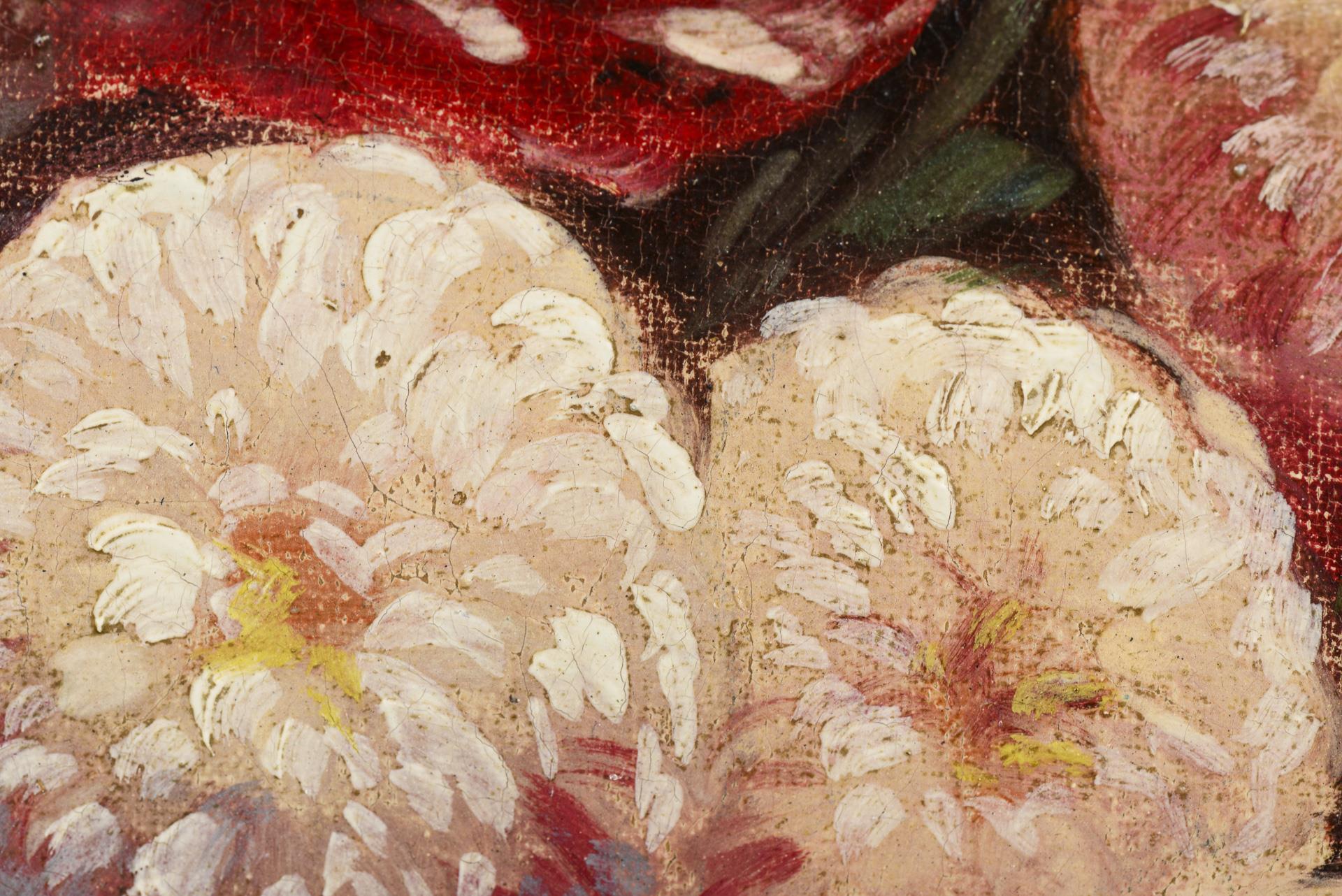 Bunter und üppiger Blumenstrauß in heller Vase. Restauriert mit Hinterklebungen.