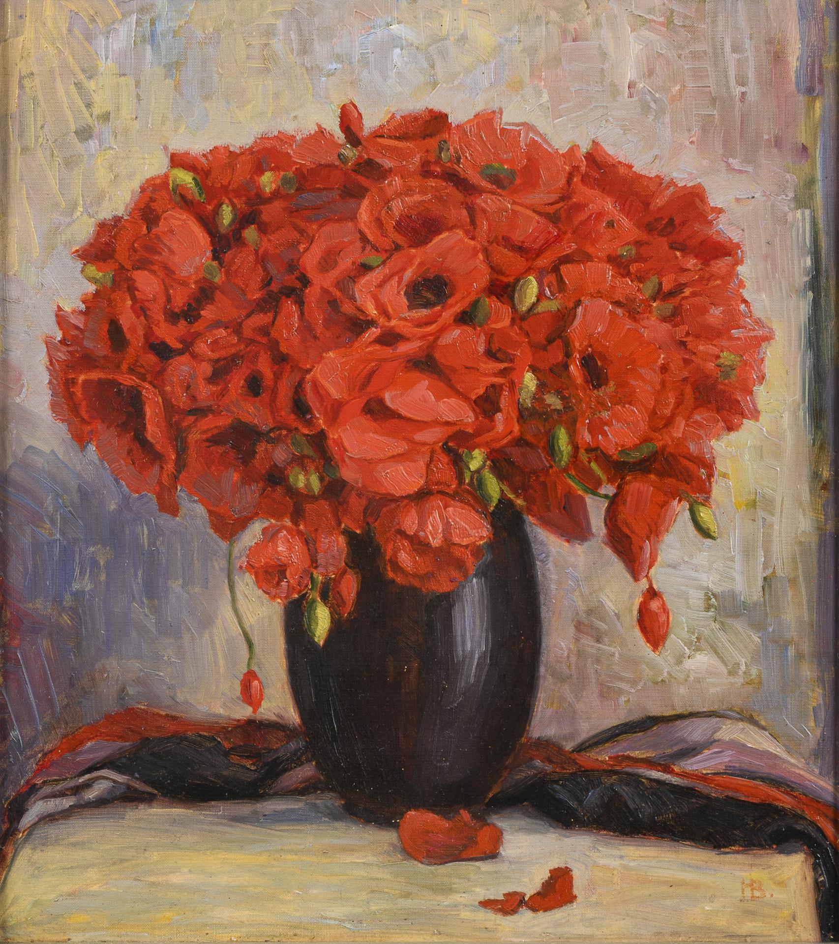 Dichter Strauß aus rotem Mohn in dunkler Vase vor hellem Hintergrund.