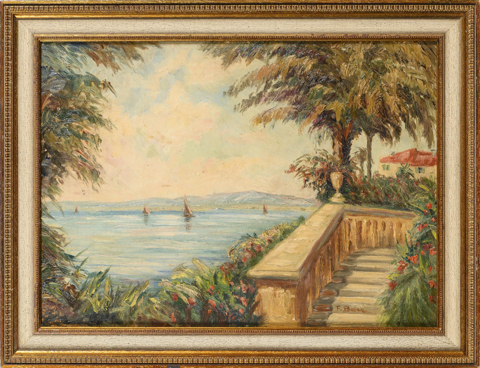 Blick von der Balustrade einer Villa über den See mit den Seglern.
