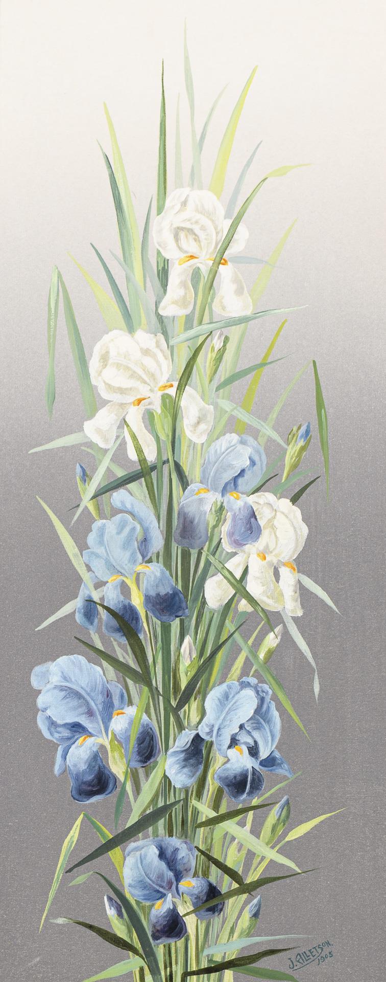 Blaue und weiße Lilien vor grauem Hintergrund.