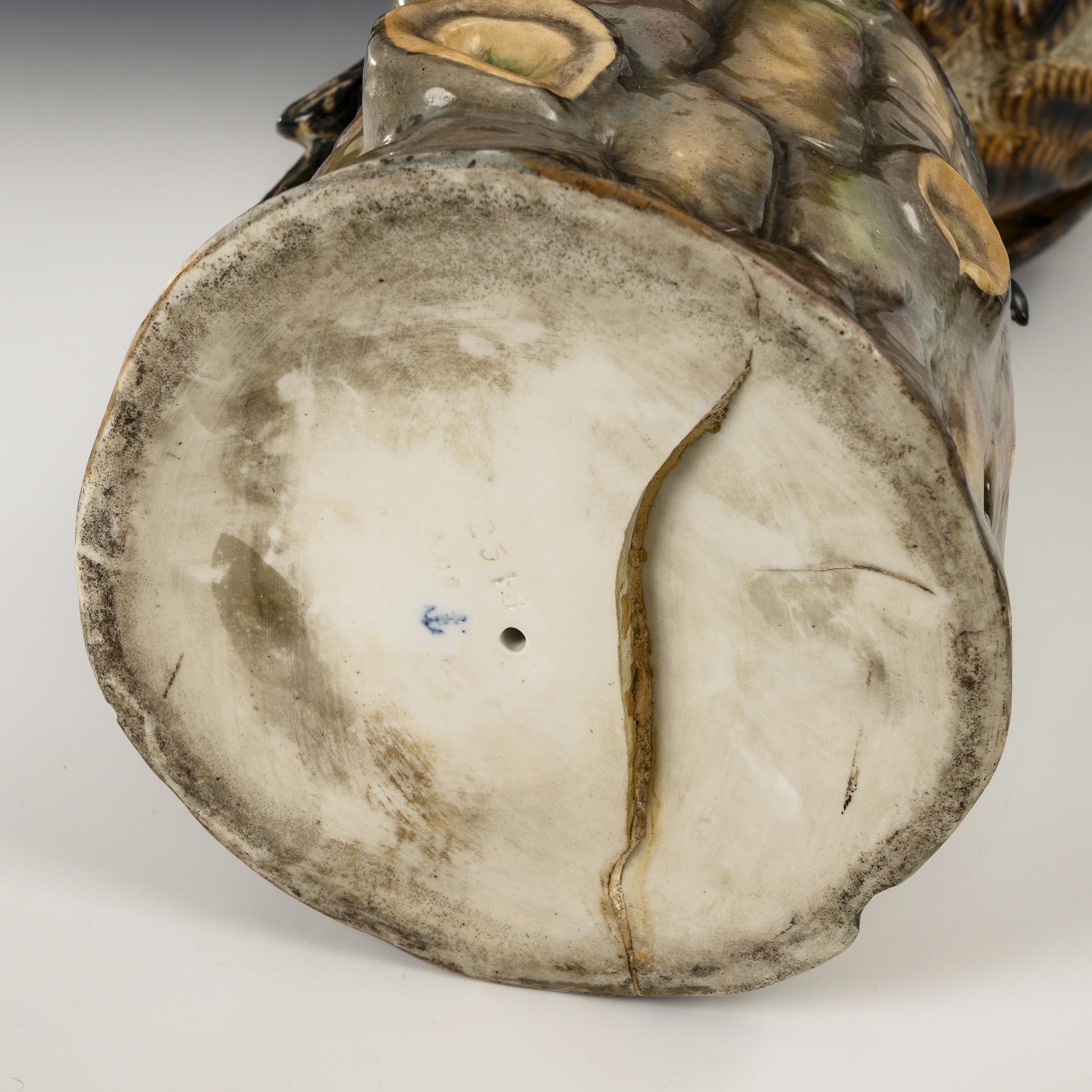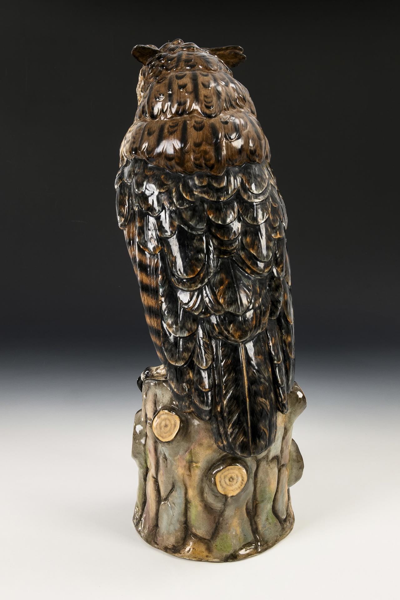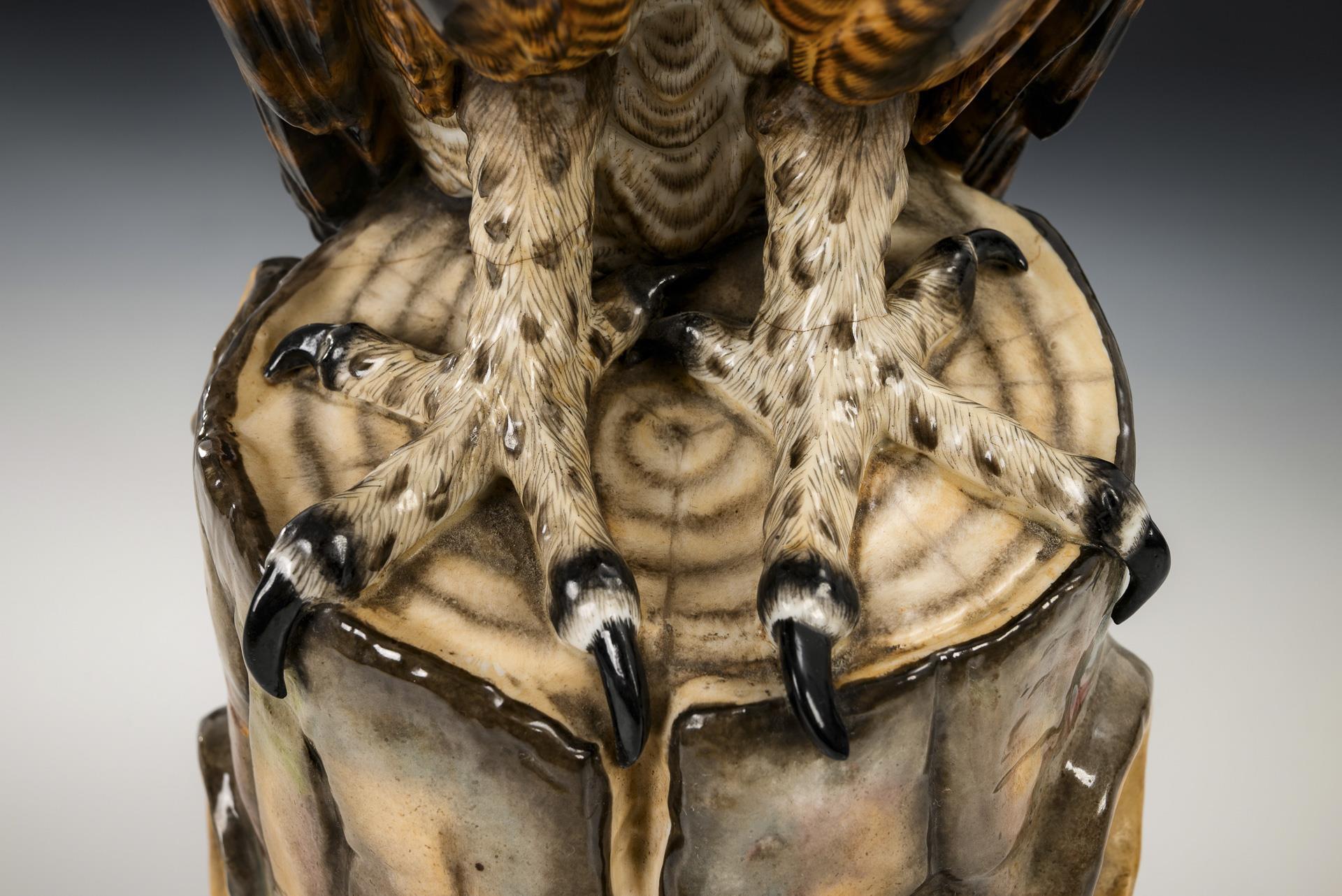 Auf einem Baumstamm sitzender Uhu mit Glasaugen. Unterseitig Boden im Brand eingesunken, Haarriss in beiden Beinen und im Baumstamm, rechte Ohrspitze restauriert.