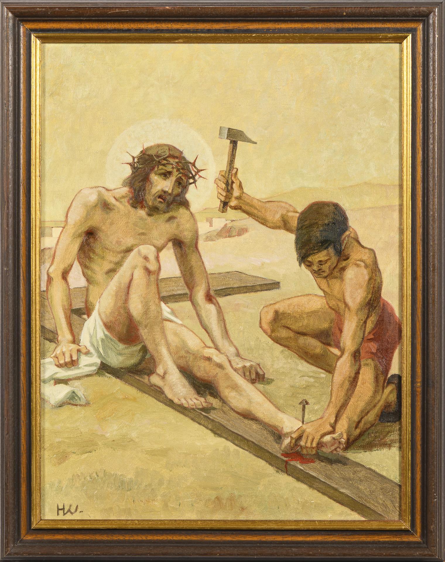 Linker Flügel eines Triptychons mit Festnagelung Jesu am Kreuz. Anbei Foto des gesamten Altarbildes.