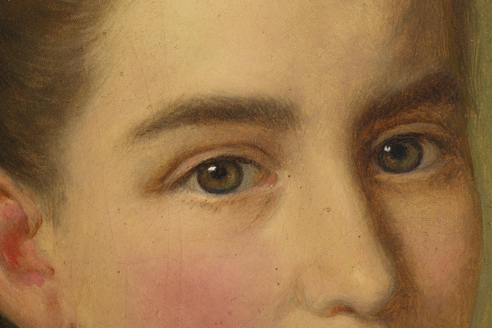 Porträt der Anna Beppler im Alter von 12 Jahren im weißen Kleid mit Kreuzanhänger. Leichte Altersspuren.