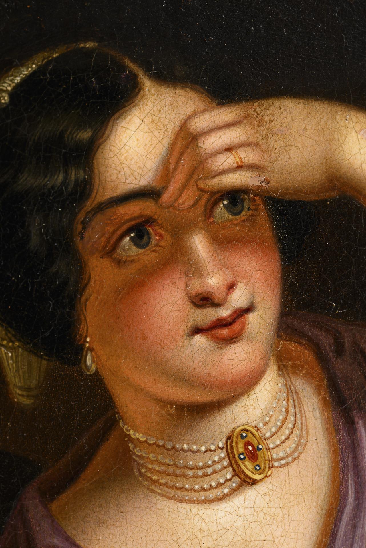 Fensterszene nach dem Vorbild der niederländschen Altmeister mit junger Frau beim Ausschau halten bei Bier und Brot. Retuschiert.