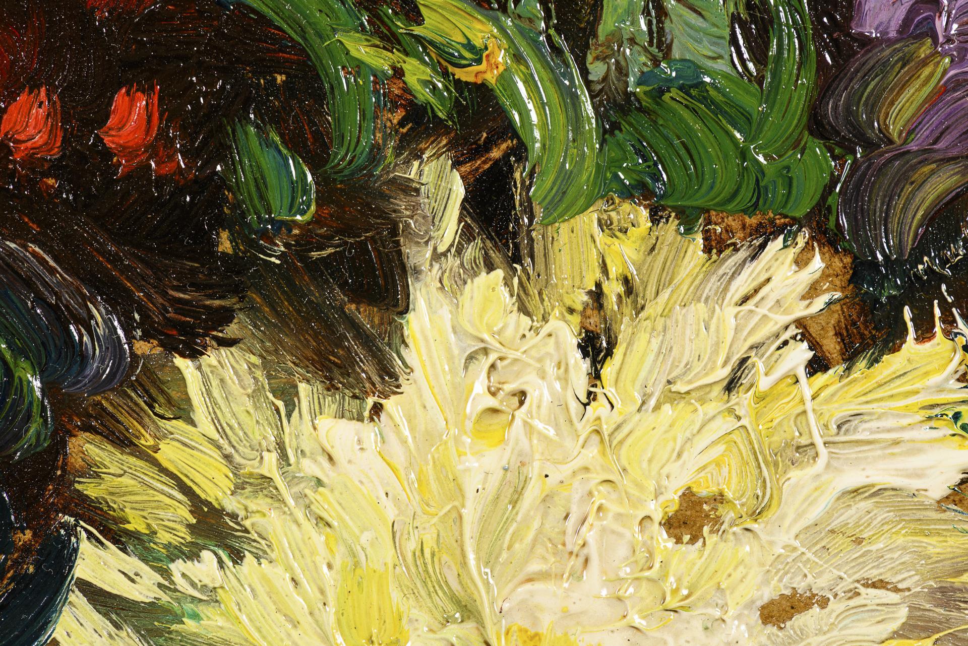 Bunter Blumenstrauß in dunkler Kanne vor bläulichem Hintergrund.