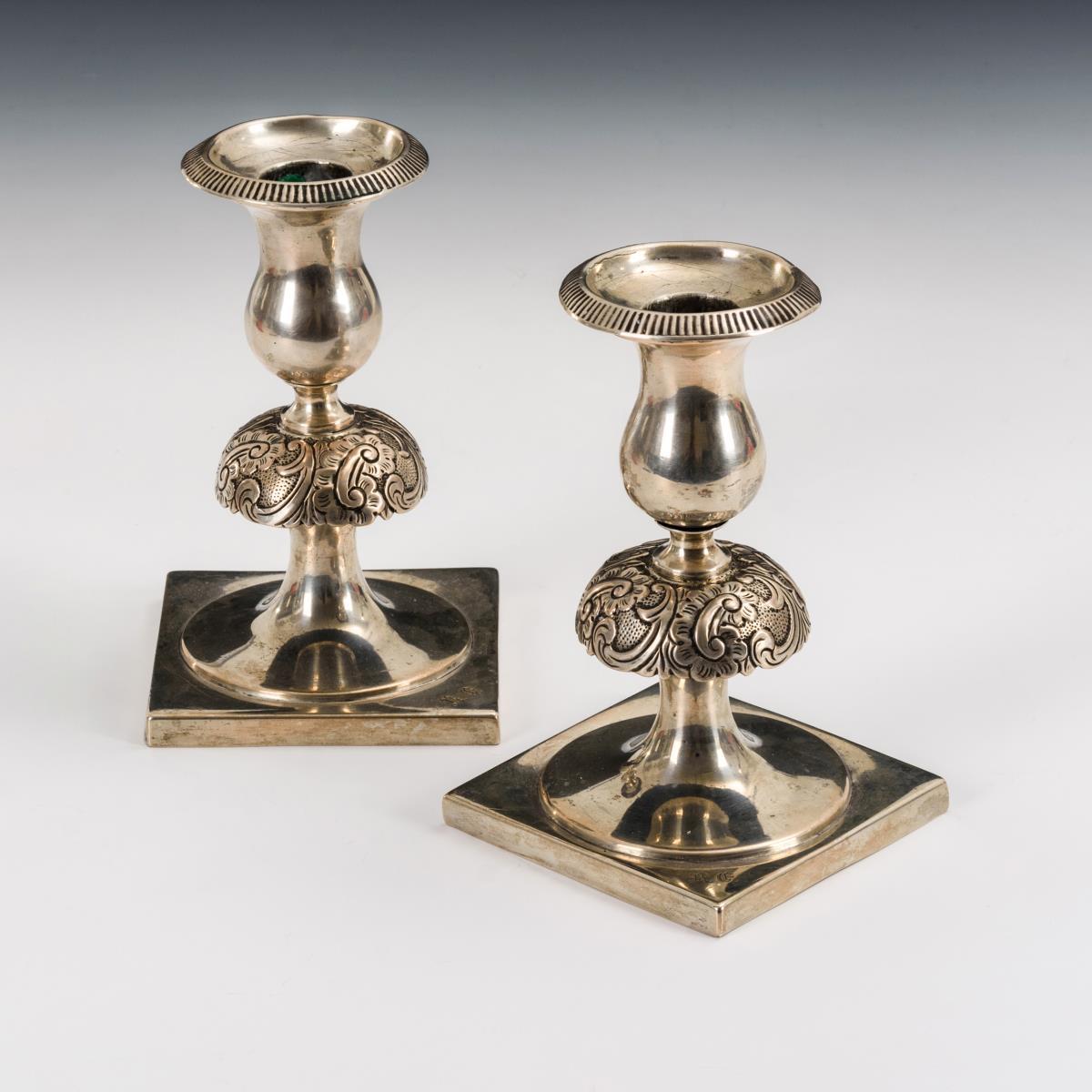 1-flammige Leuchter mit herausnehmbaren Tropftellern. Mit gotischer Monogrammgravur an der quadratischen Plinthe. Alte Reparaturspuren, Tropfteller und Tüllen gedellt.