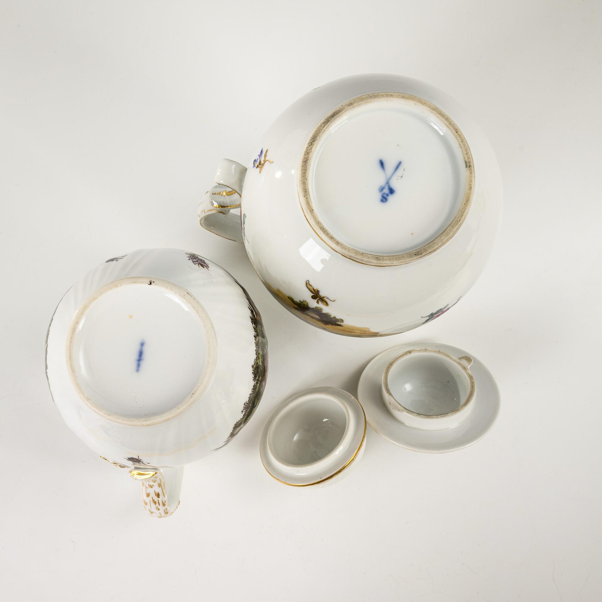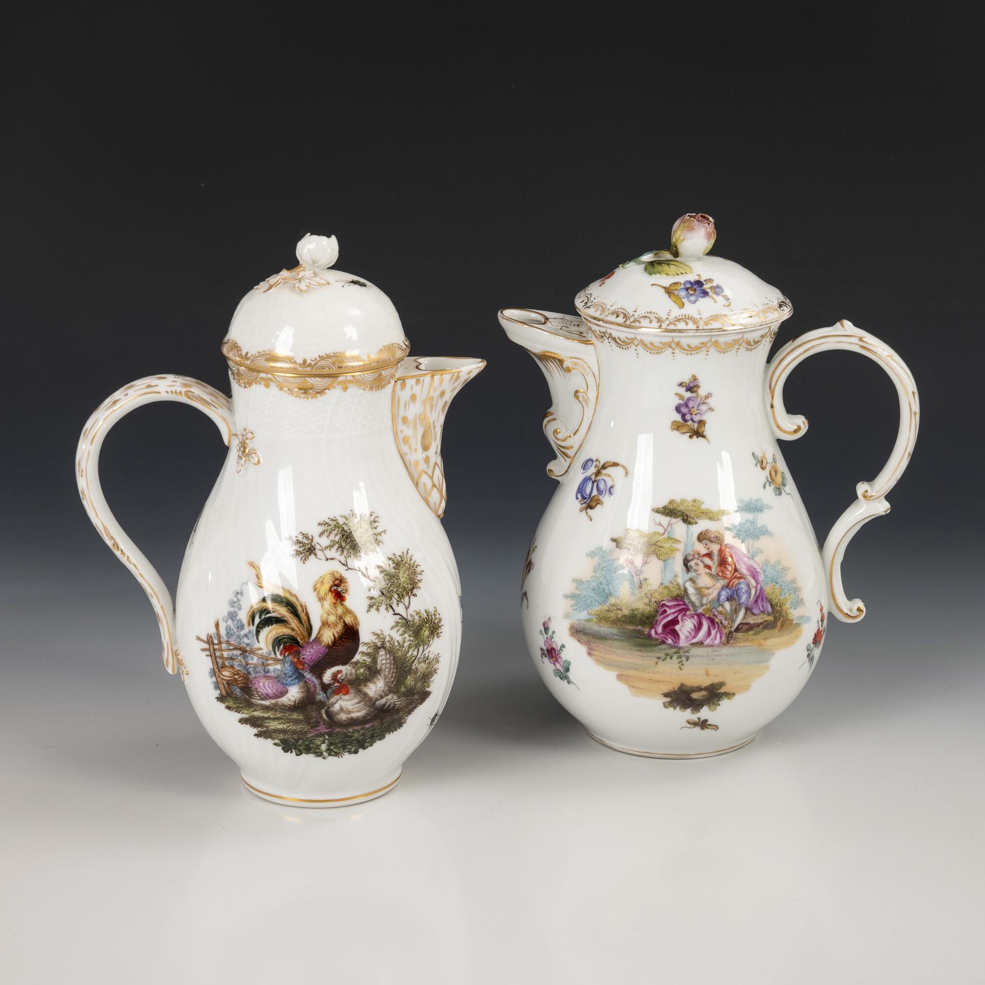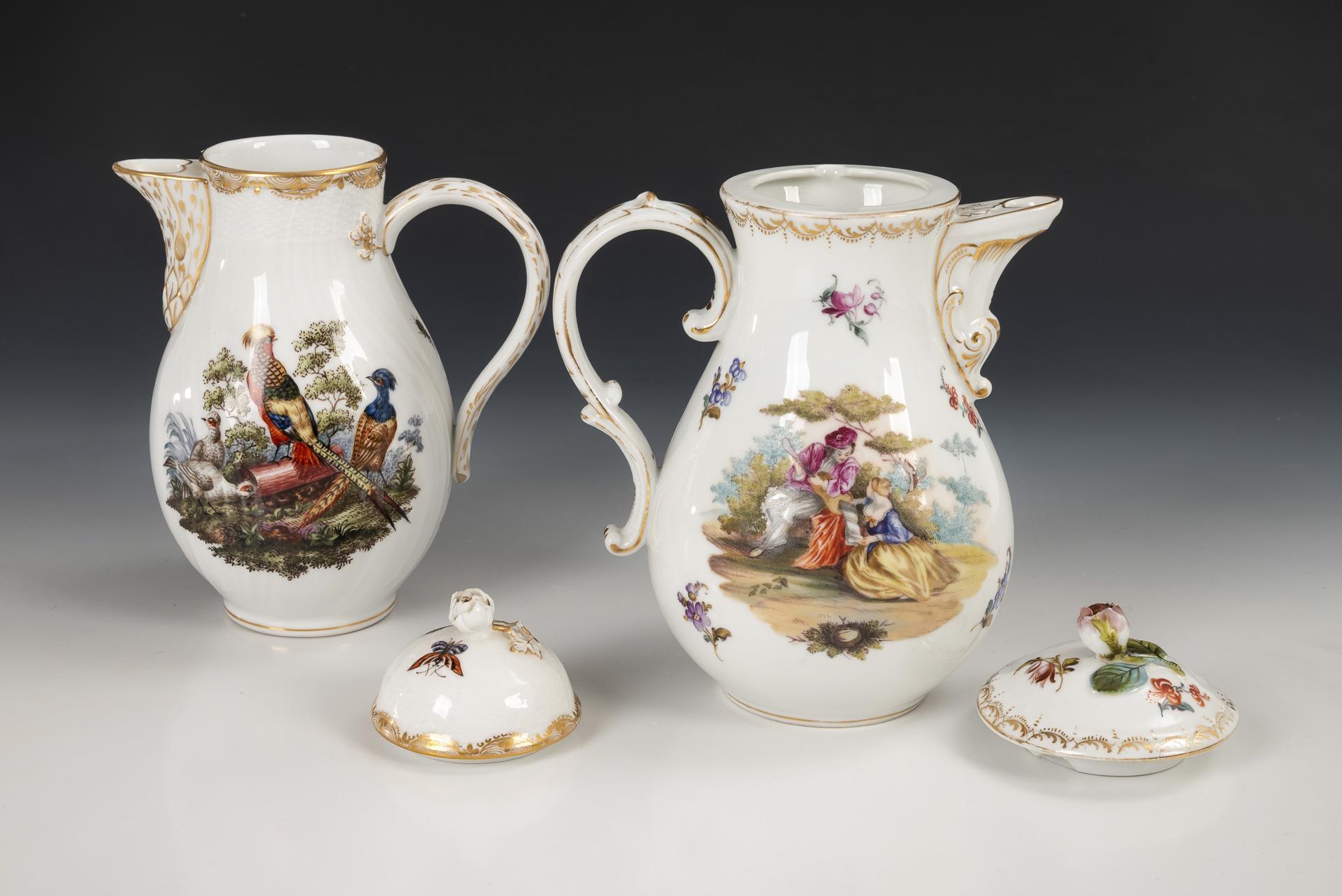 1x KPM BERLIN, Hausmalerei: Birnkanne Modell "Neuozier" mit Geflügelmalerei. / 1x SCHLAGGENWALD: Birnkanne mit Watteau-Malerei. Deckelknäufe bestoßen, 1 Deckelnase fehlt.