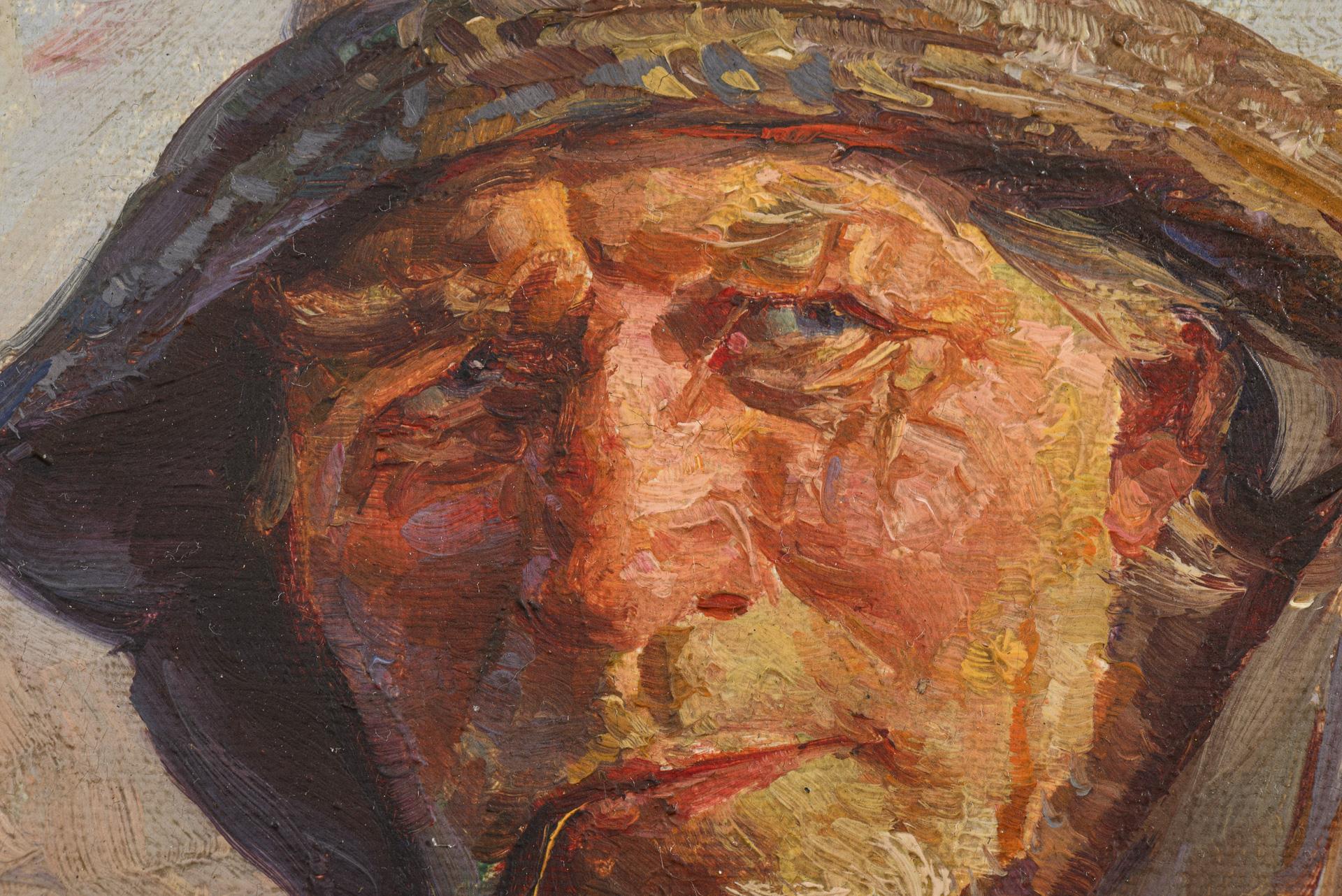 Porträt eines alten Mannes mit Pfeife und Fischerhut im Sonnenschein.