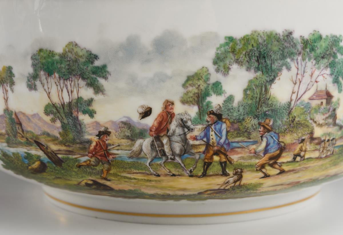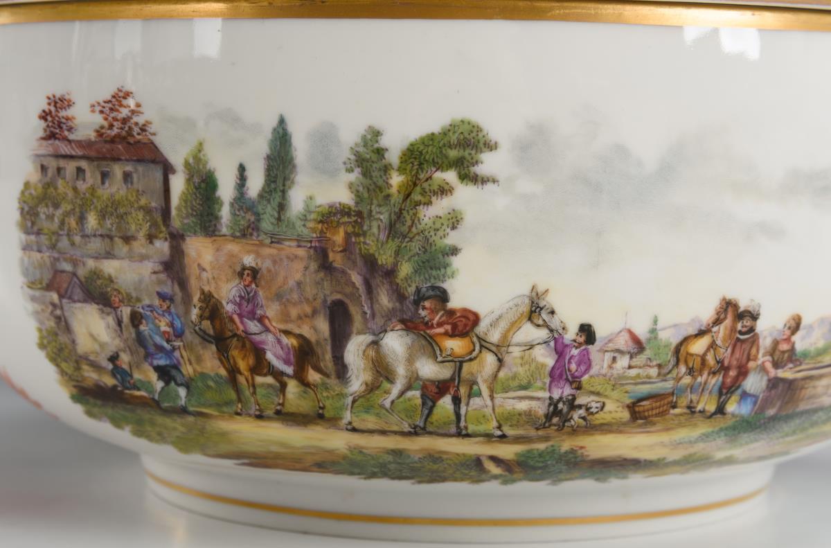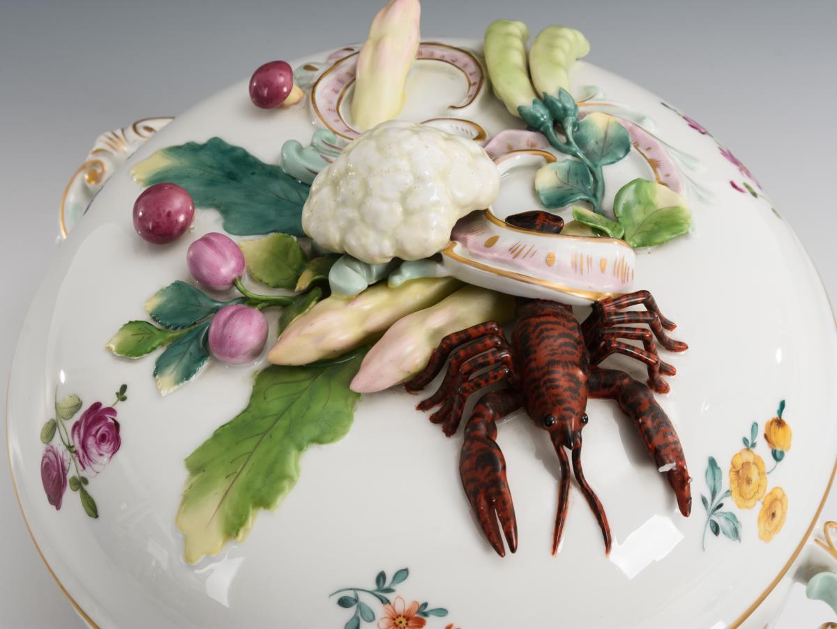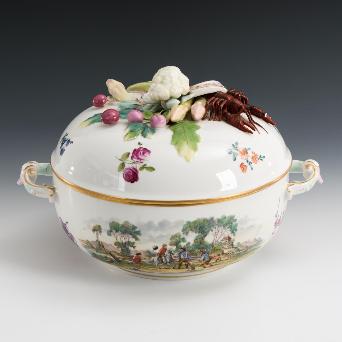 Terrine mit 2 Rocaillehenkeln und Deckel mit Gemüse- und Hummerbelag. Auf der Wandung zwei Soldatenszenen. 1 Hummerschere bestoßen.