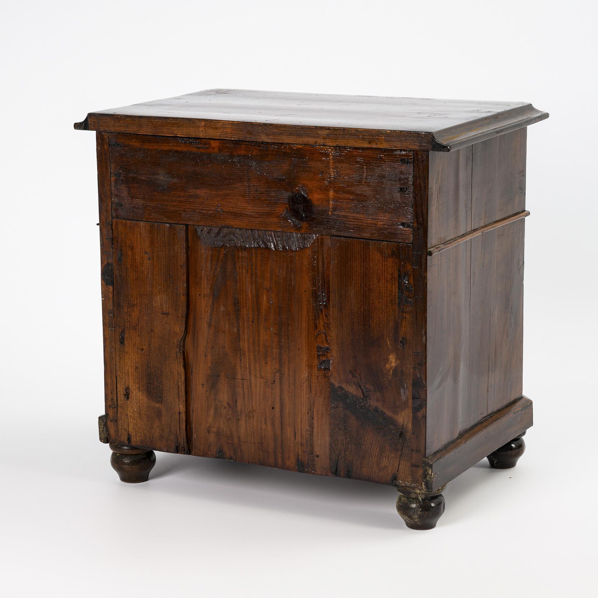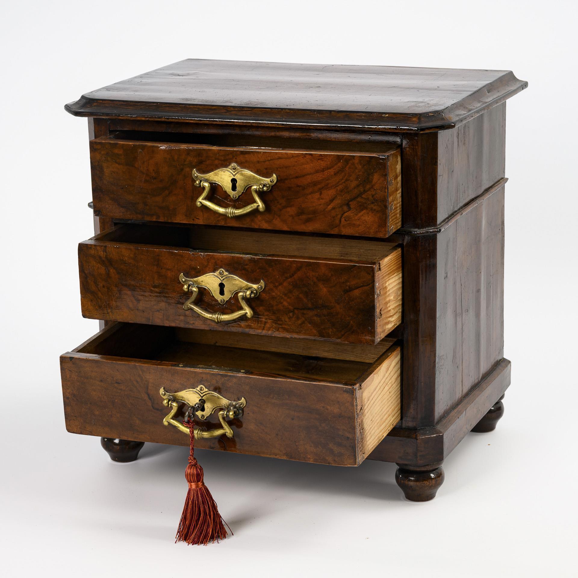 Auf Kugelfüßen stehender, 3-schübiger Korpus mit abgekanteten Ecken und profilierte Deckplatte; geschweifte Beschläge. Kleinere Trockenrisse an den Seiten, minimale Furnierausbesserungen, überlackiert, sonst kaum Alters-/Gebrauchsspuren.