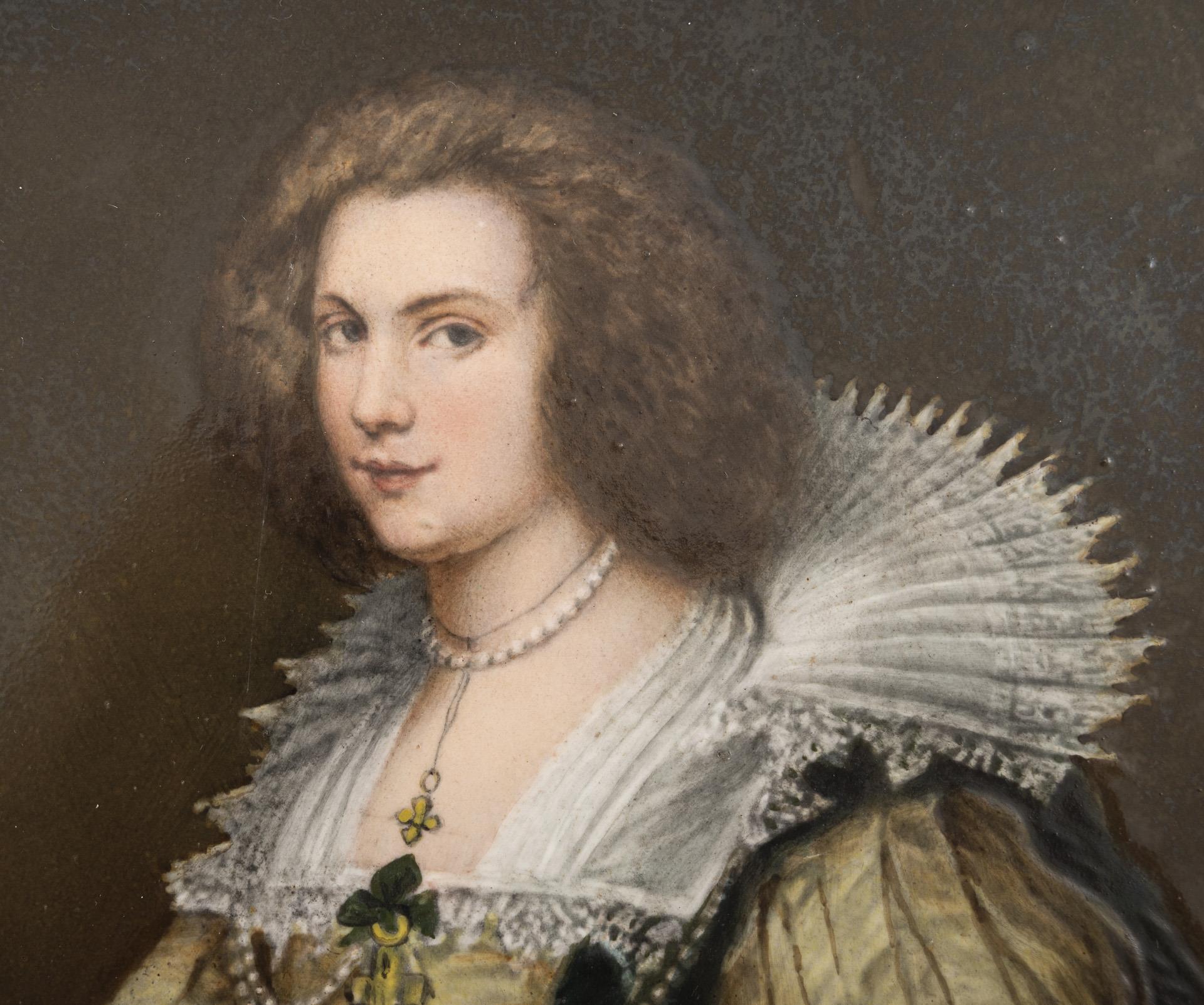 Rechteckige Keramikplatte mit dem Porträt der Maria de Tassis (1611-1638), nach dem 1629/30 entstandenen Gemälde von Anthonis van Dyck (1599–1641). 1 Ecke bestoßen, 1 Kratzer auf der Malerei.