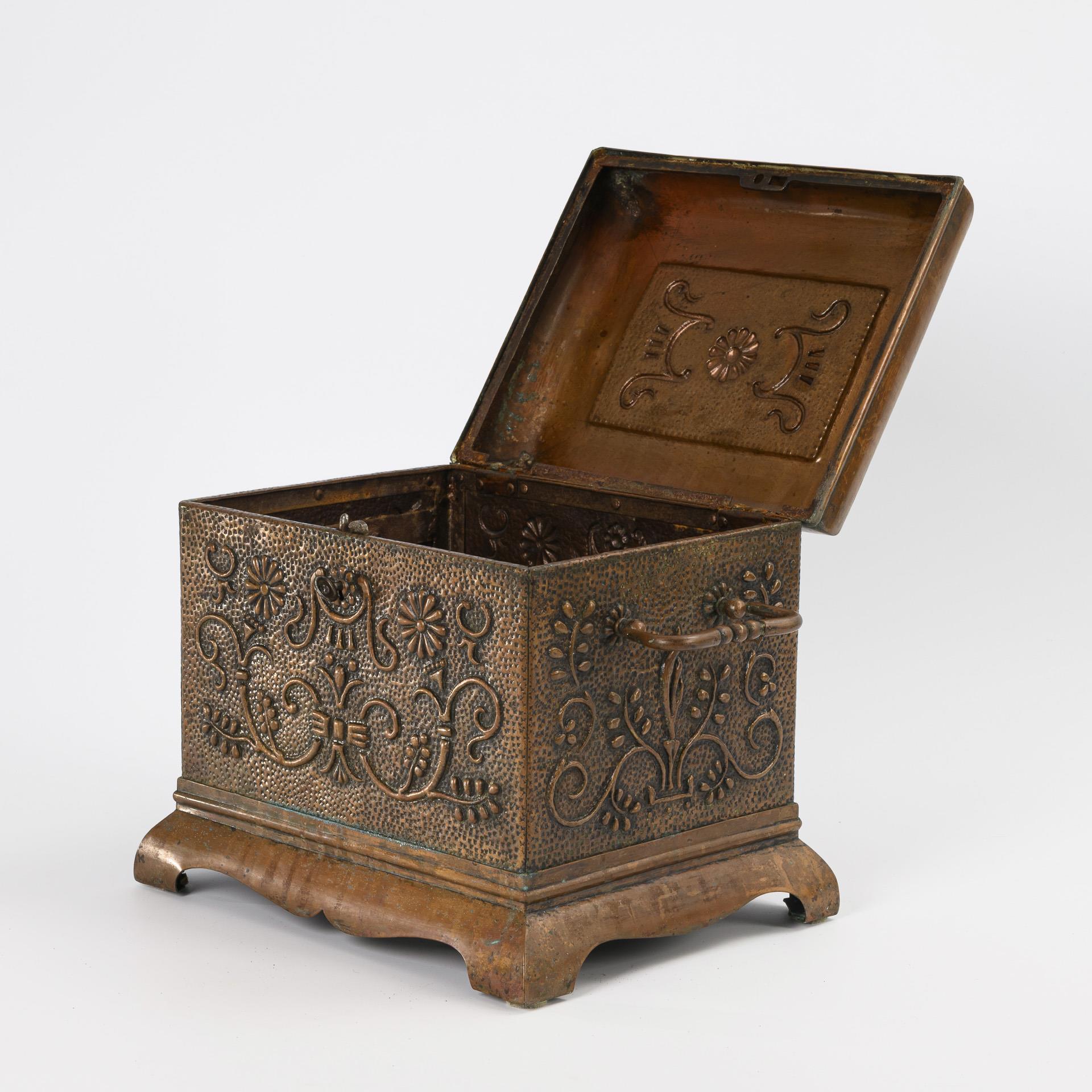 Kupfer getrieben und punziert, Eisen-Montierung und -Boden. 27 x 33 x 26 cm. 5,2 kg.