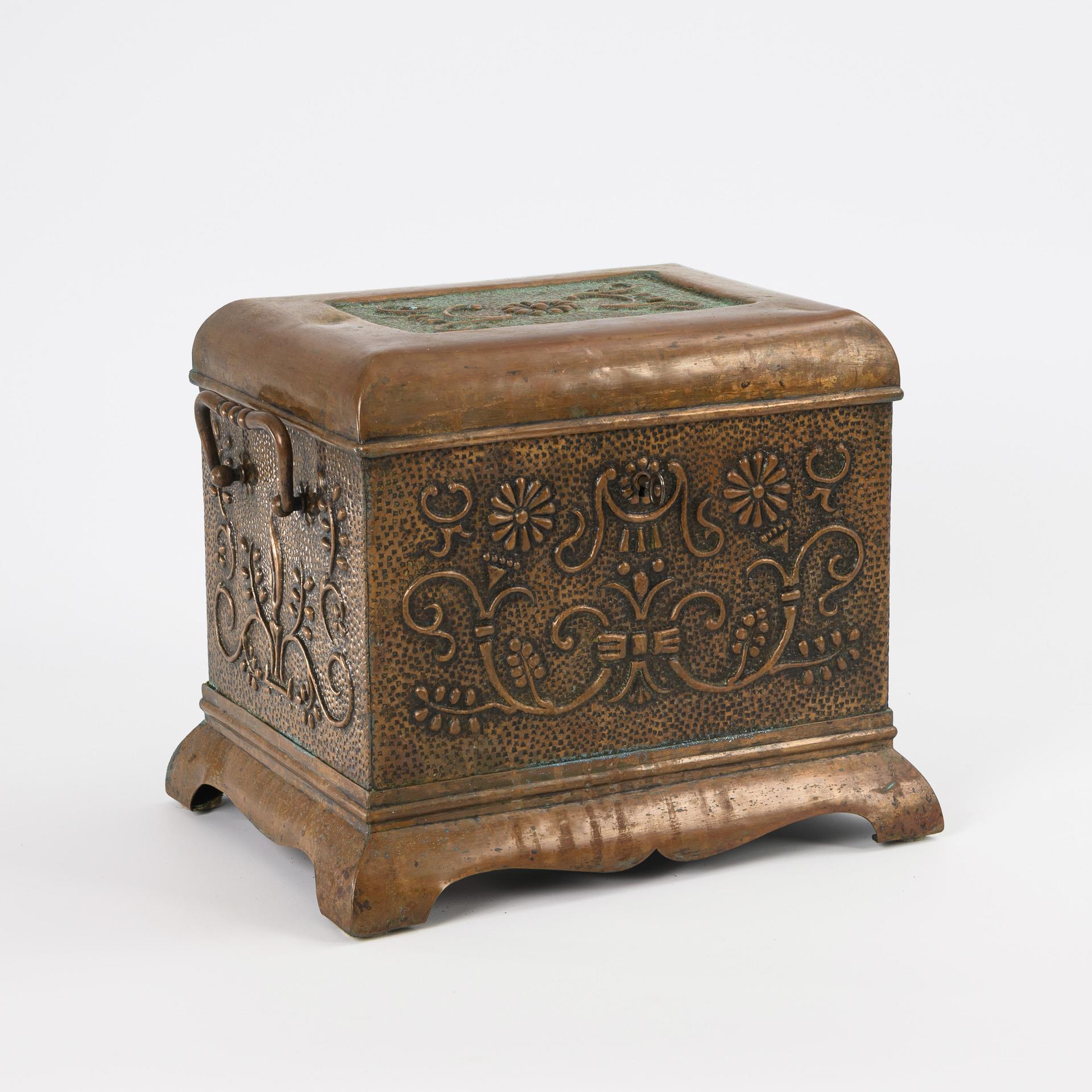 Truhenförmige Kiste mit ausgestellter Sockelzone und scharnierten Griffen an den Seiten. Allseits und auf dem Deckel stilisiert-vegetabiles Reliefornament. 1 minimaler Riss an der hinteren Deckelkante, in den Deckelecken Lötspuren, Eisen rostig, sonst wenige Alters-/Gebrauchsspuren.