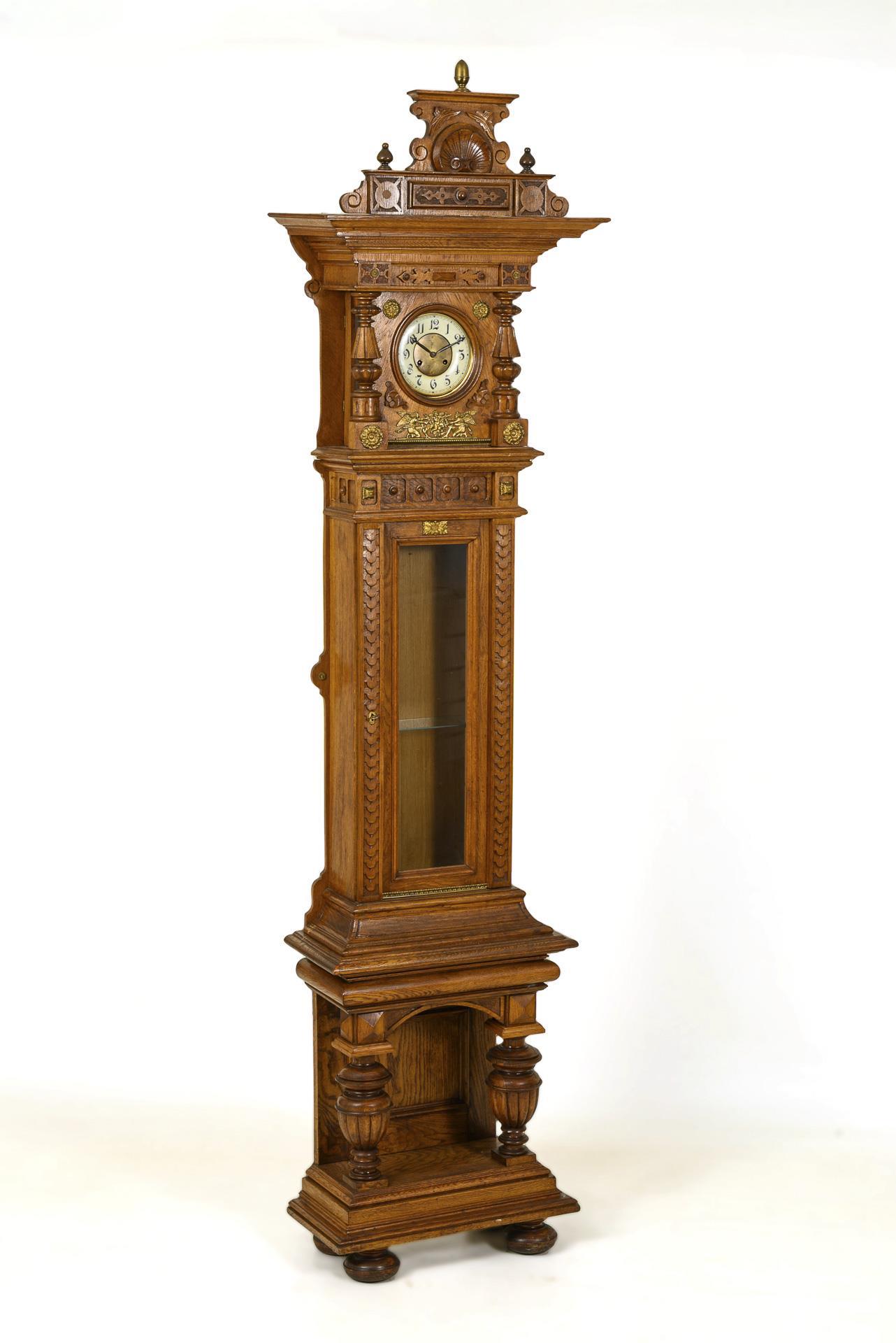 Prunkgehäuse mit Schmuckgiebel, verglastem Pendelkasten als Vitrinenfach mit Glaseinlegeboden, offenem Sockel mit Rundbogensegment und Balustersäulen, auf 4 gedrückten Kugelfüßen. Reich beschnitzt mit historistischen Dekorelementen, florale Messingapplikationen und 1 klassizistischer Zierbeschlag mit Putto und geflügelten Wesen. Gehäuse leicht wackelnd.