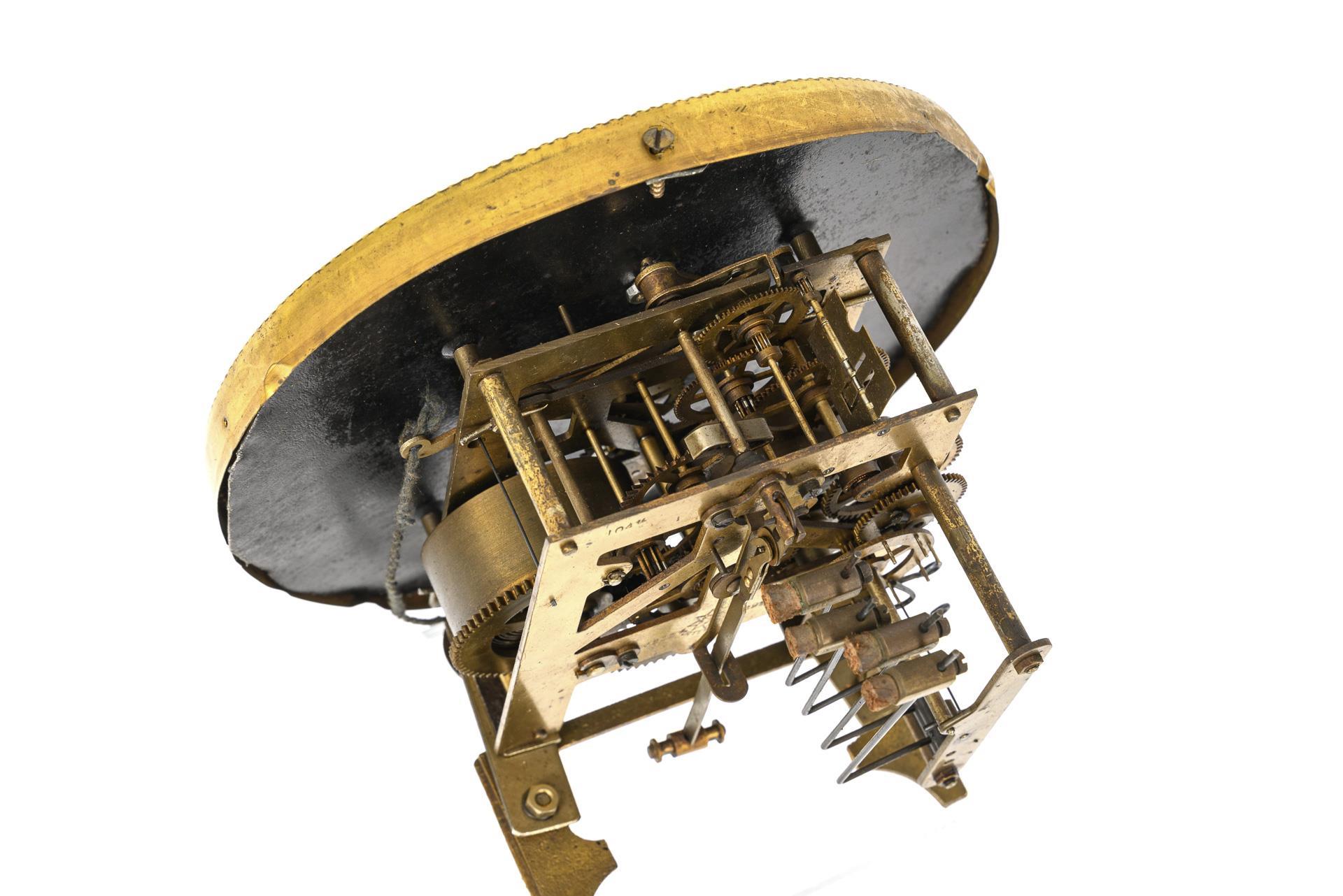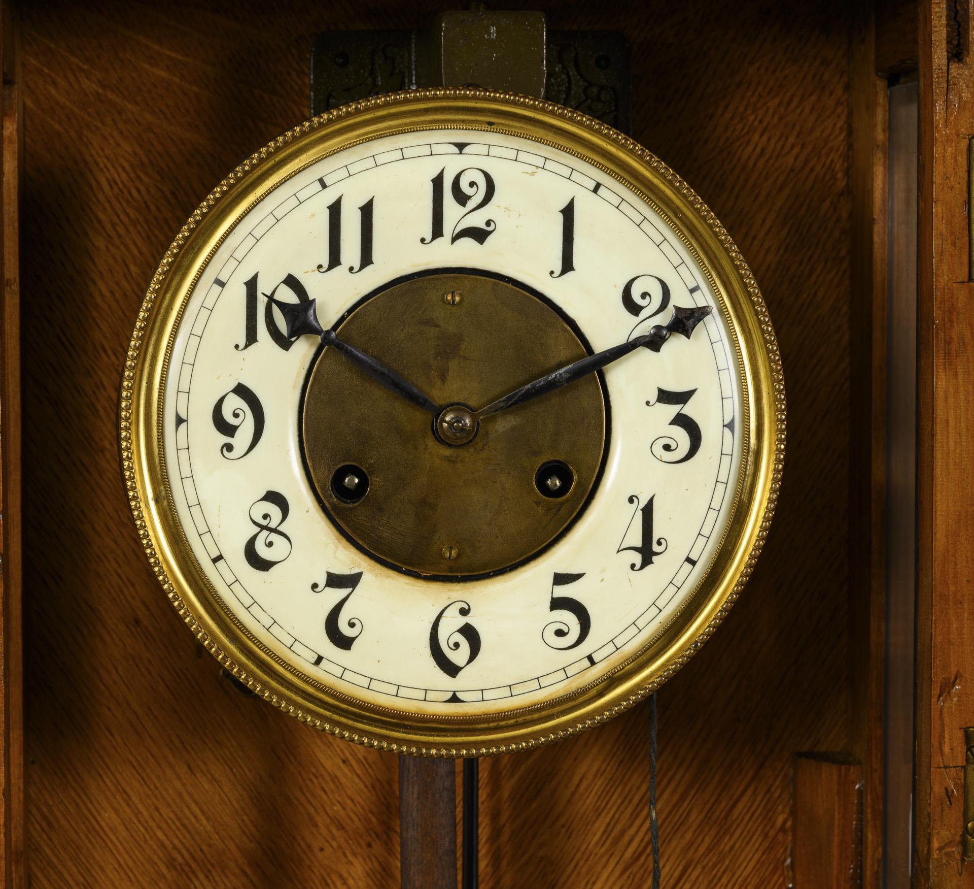 "Junghans Württemberg" gemarktes Werk mit Halbstundenschlag auf 4 Tonstäben. Seitlicher Repetitionszug. Läuft nicht, Revision empfohlen. Regulatorziffernblatt mit weißem Emailziffernring und arabischen Zahlen.