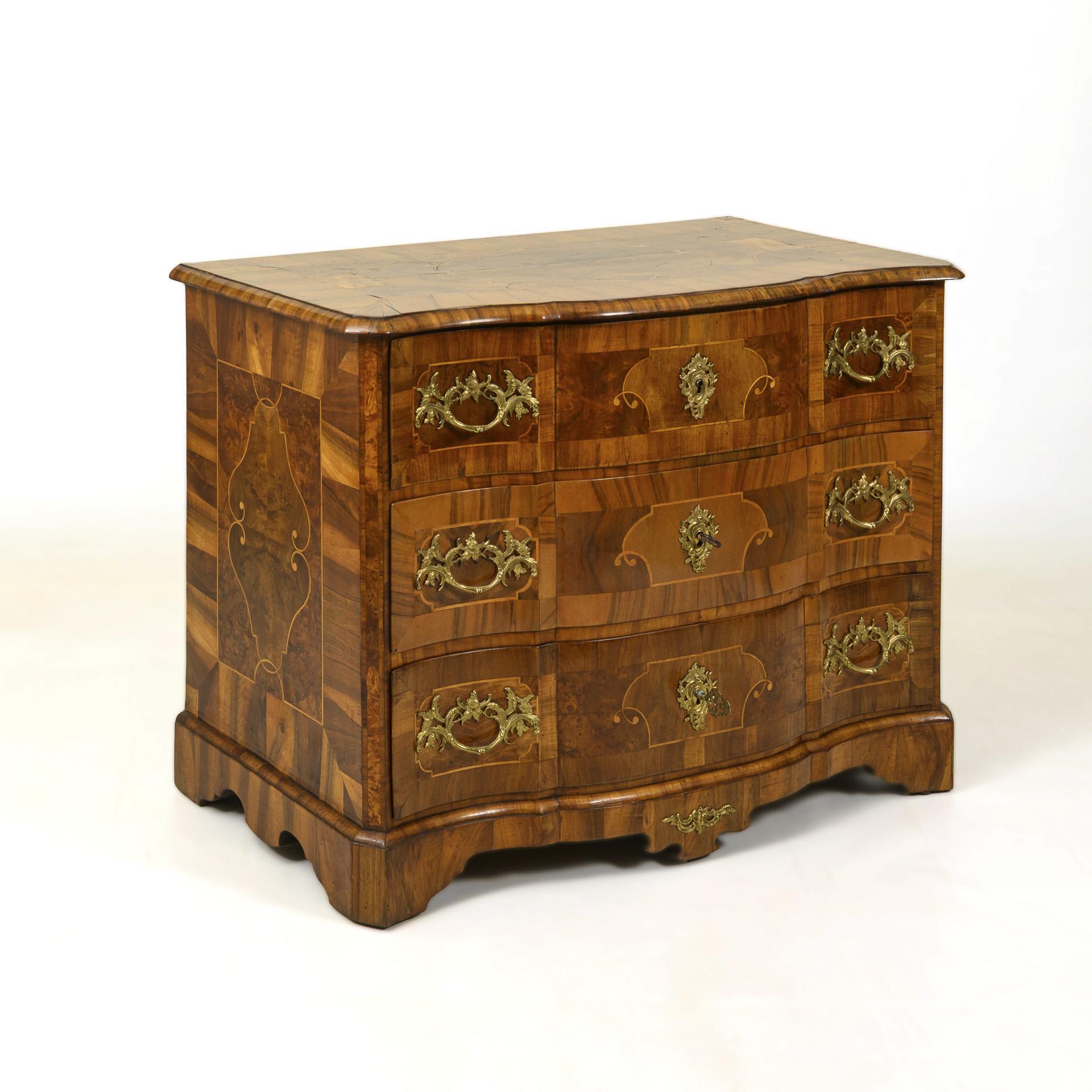 3-schübiger Korpus mit geschwungener Front, geschrägten Ecken und geschweifter Sockelzarge, auf 4 gedrückten Kugelfüßen. Kunstvoller Dekor aus Scheinreserven mit lebhaft gemasertem Furnier und Bandeinlagen. Florale Schlüssellochbeschläge und Griffe aus Bronze. Restauriert, mit Ergänzungen, u.a. mittlerer Schub ergänzt, oberster Schub nicht schließend, inaktiver Anobienbefall.