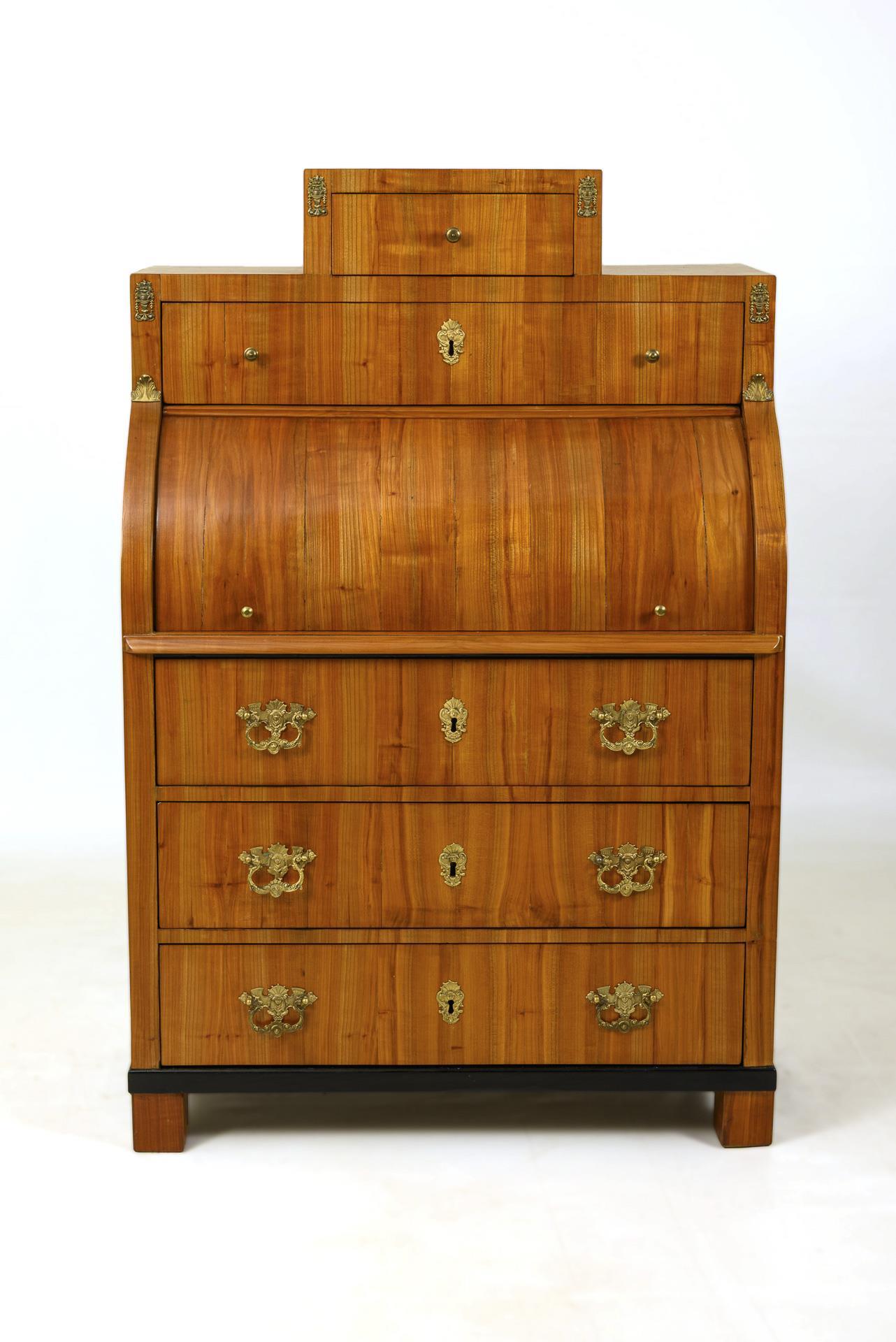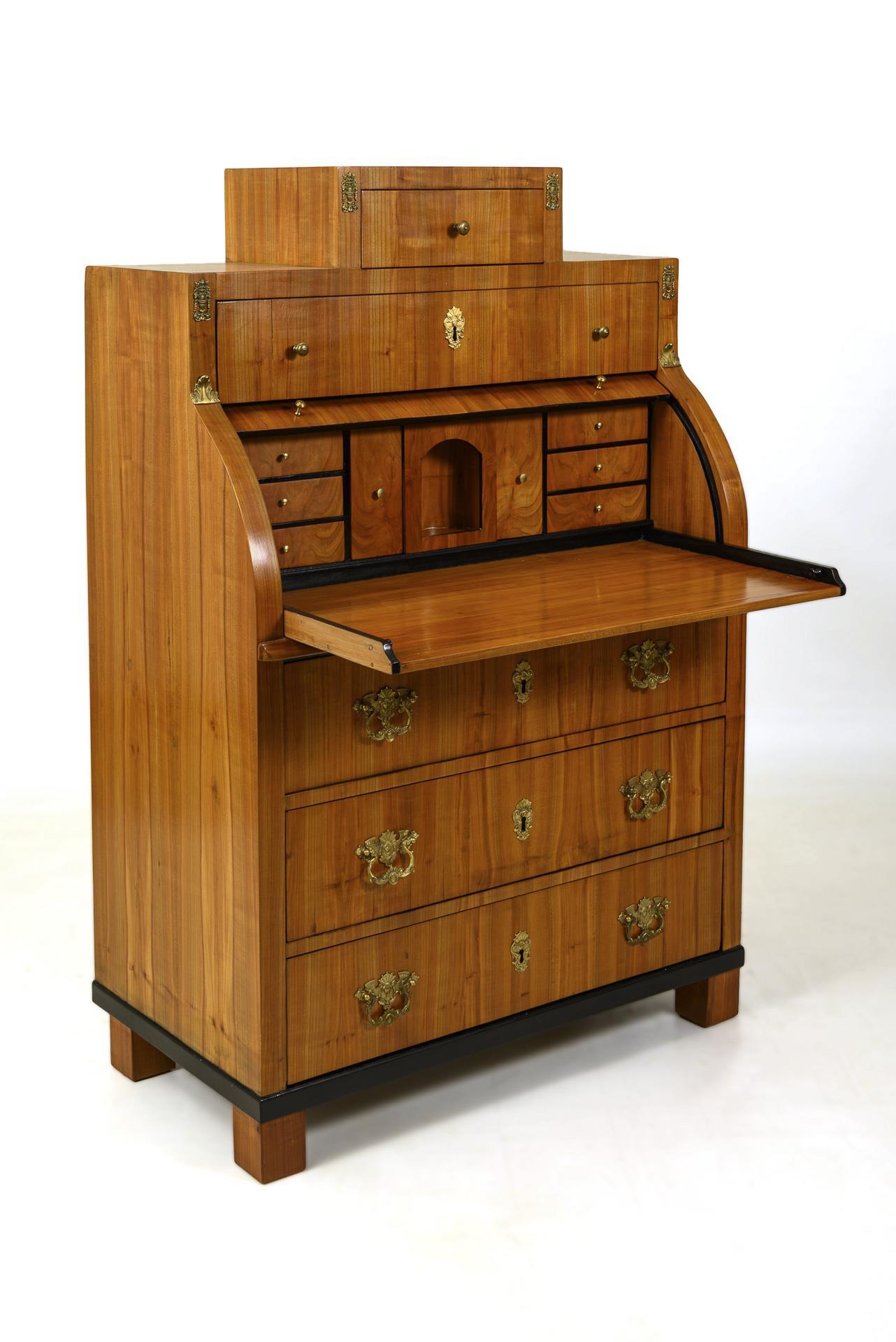 5-schübiger Korpus mit gestuftem Giebel und Rollklappe, auf 4 Klotzfüßen. Innen ausziehbare Schreibplatte, zentraler Mittelfacheinschub als Rundbogennische mit 3 kleinen, dahinter liegenden Geheimschüben, flankiert von jeweils 1 Vertikalschub und 3 kleinen Schüben. Historistische Beschläge und Knäufe aus Messing. Restauriert, mit Ergänzungen.