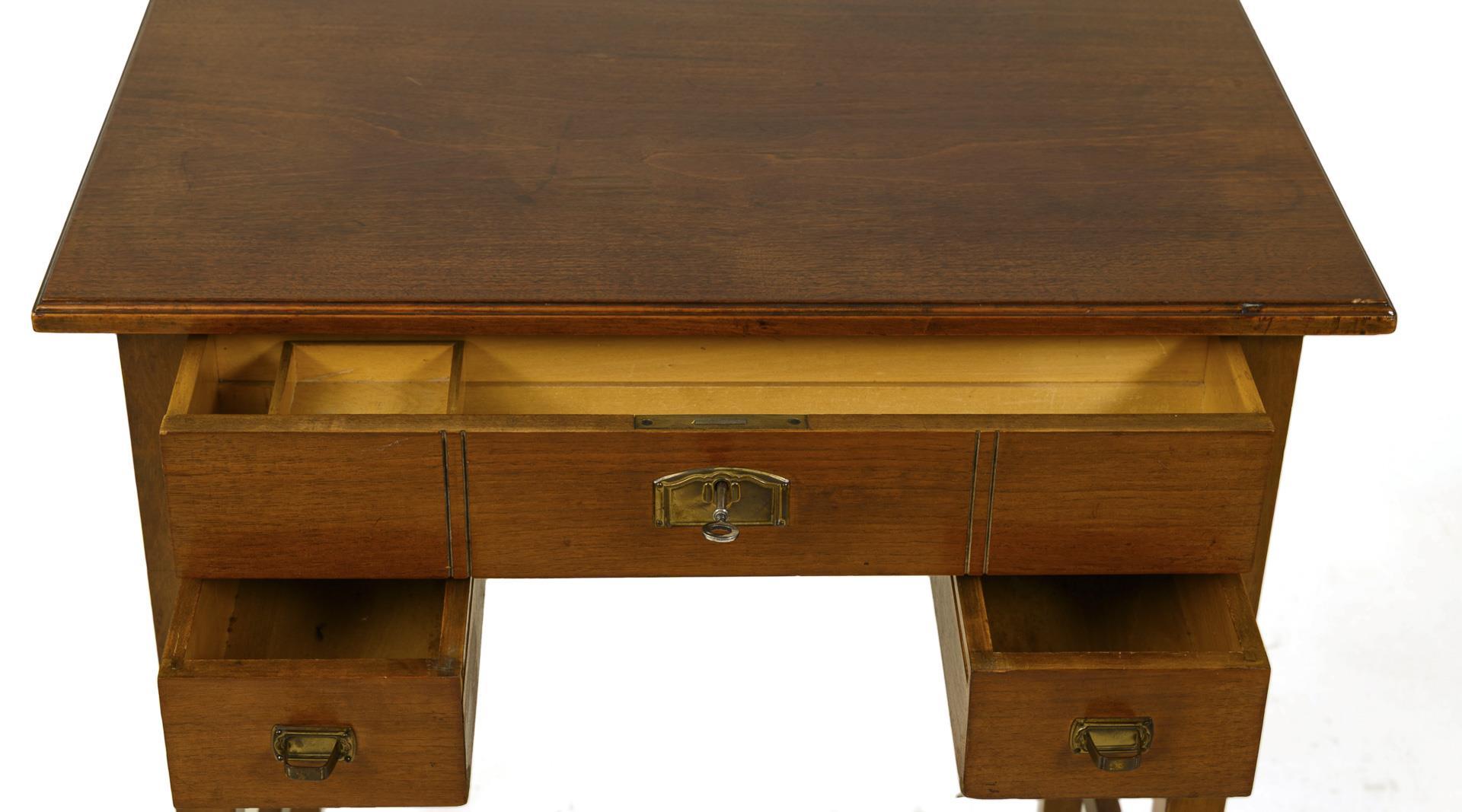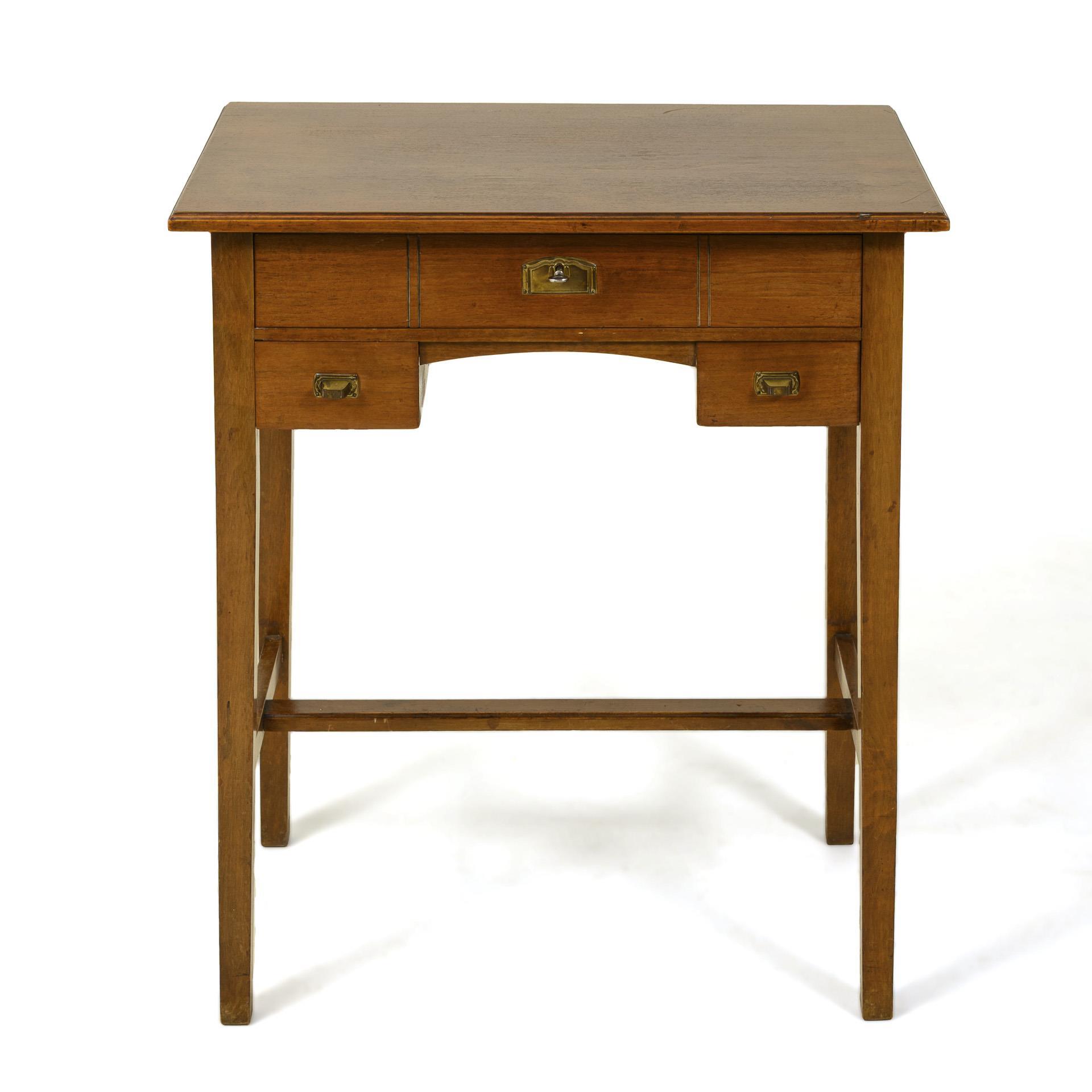 Rechteckige Deckplatte mit Profilkante über eingerücktem Zargenkasten mit 3 Schüben, auf 4 geraden Beinen mit Querverstrebung. Breiter Schub mit 2 Fächern und schiebbarem Kästchen. Messingbeschläge, teils mit Griffen. Restauriert, mit Ergänzungen. Deckplatte mit Kratzspuren, partiell Defekte am Holz.