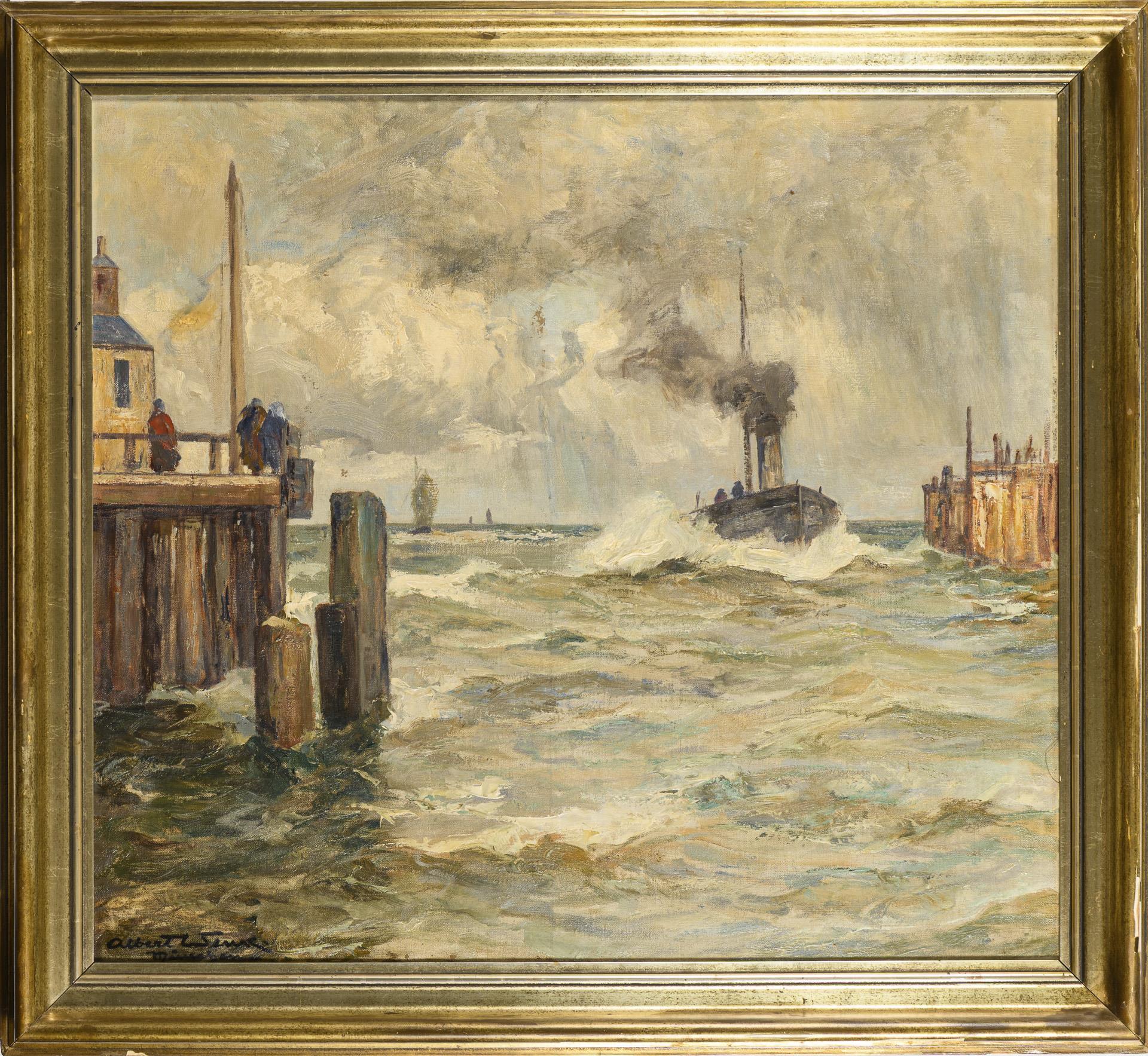 Dampfer bei der Einfahrt in den Hafen an einem bewölkten Tag. Eine restaurierte Stelle mit Hinterklebung.