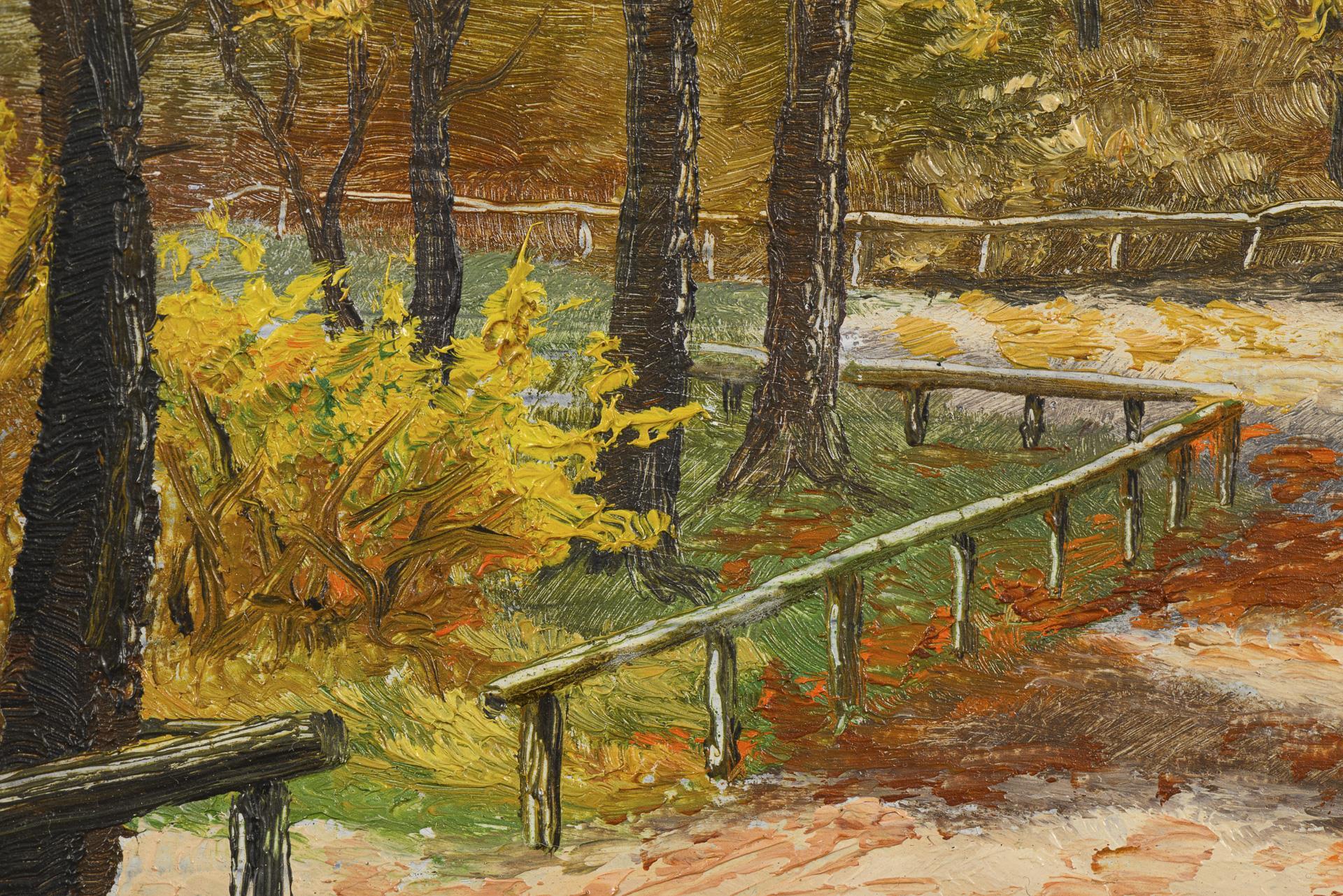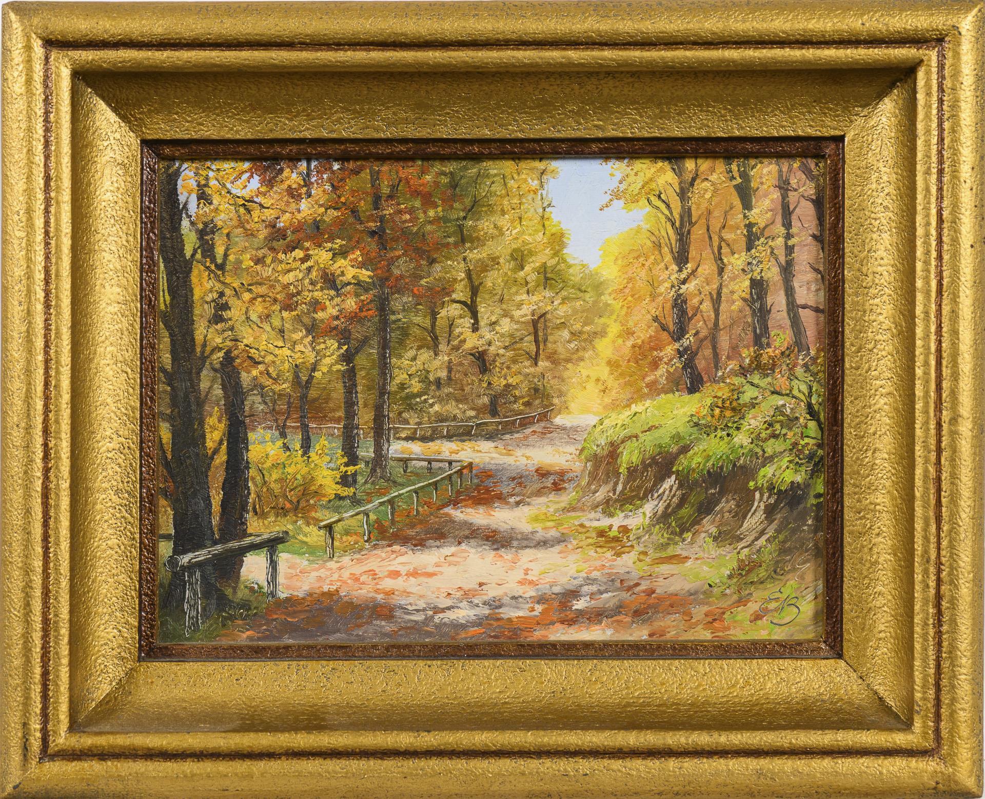 Späte Arbeit der Künstlerin mit befestigten Wegen in herbstlichem Wald.