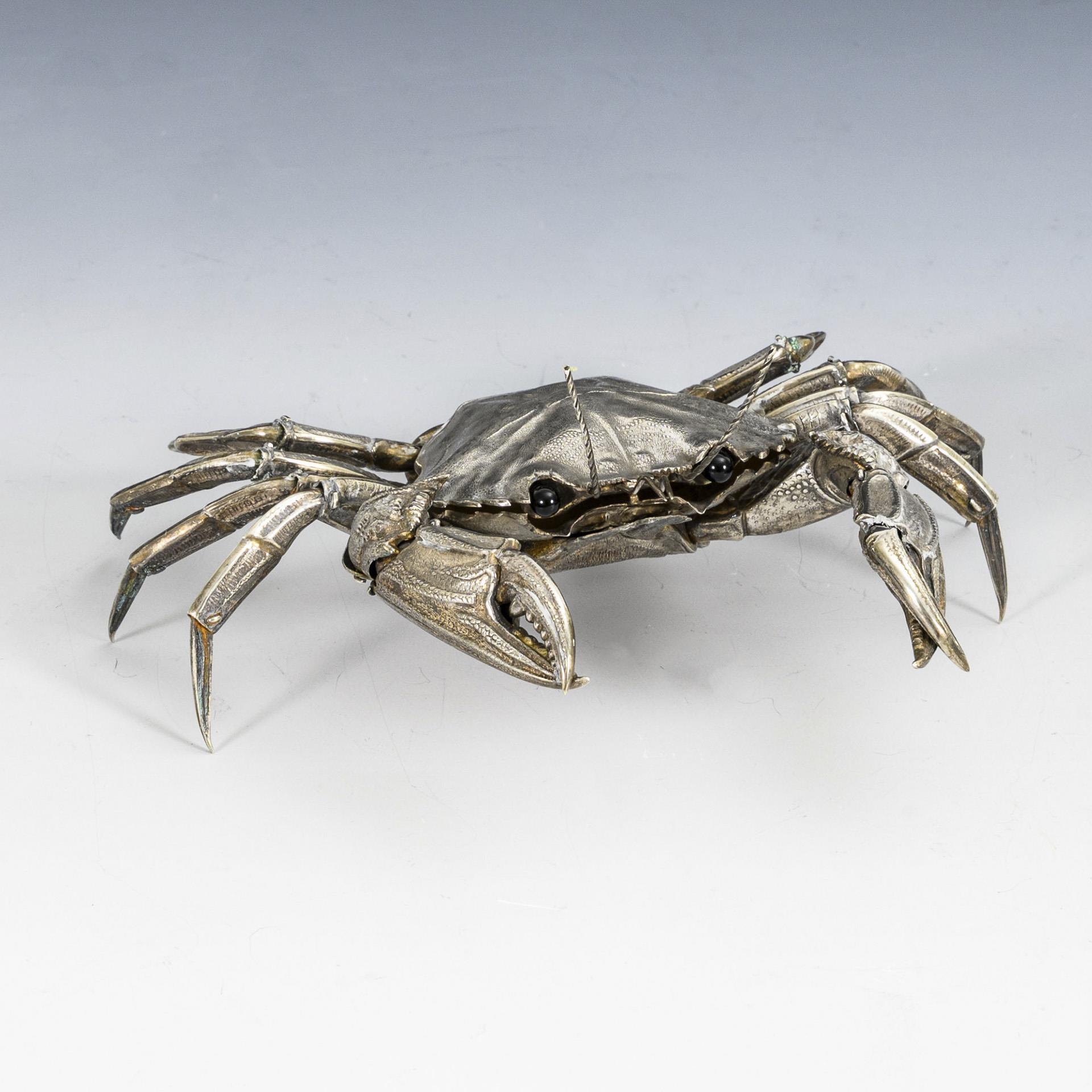 Naturalistisch gestaltete Krabbe mit Glasaugen und federnd gearbeiteten Gelenken an den Beinen und Scheren. Der Körper mit aufklappbarem Rückenschild ist als Dose gearbeitet. 1 Scherenzange lose beiliegend.