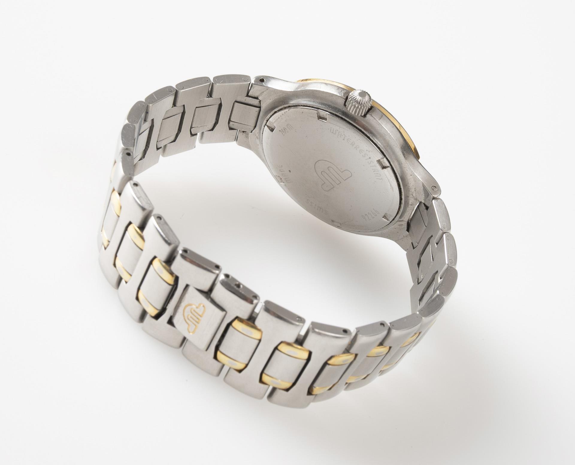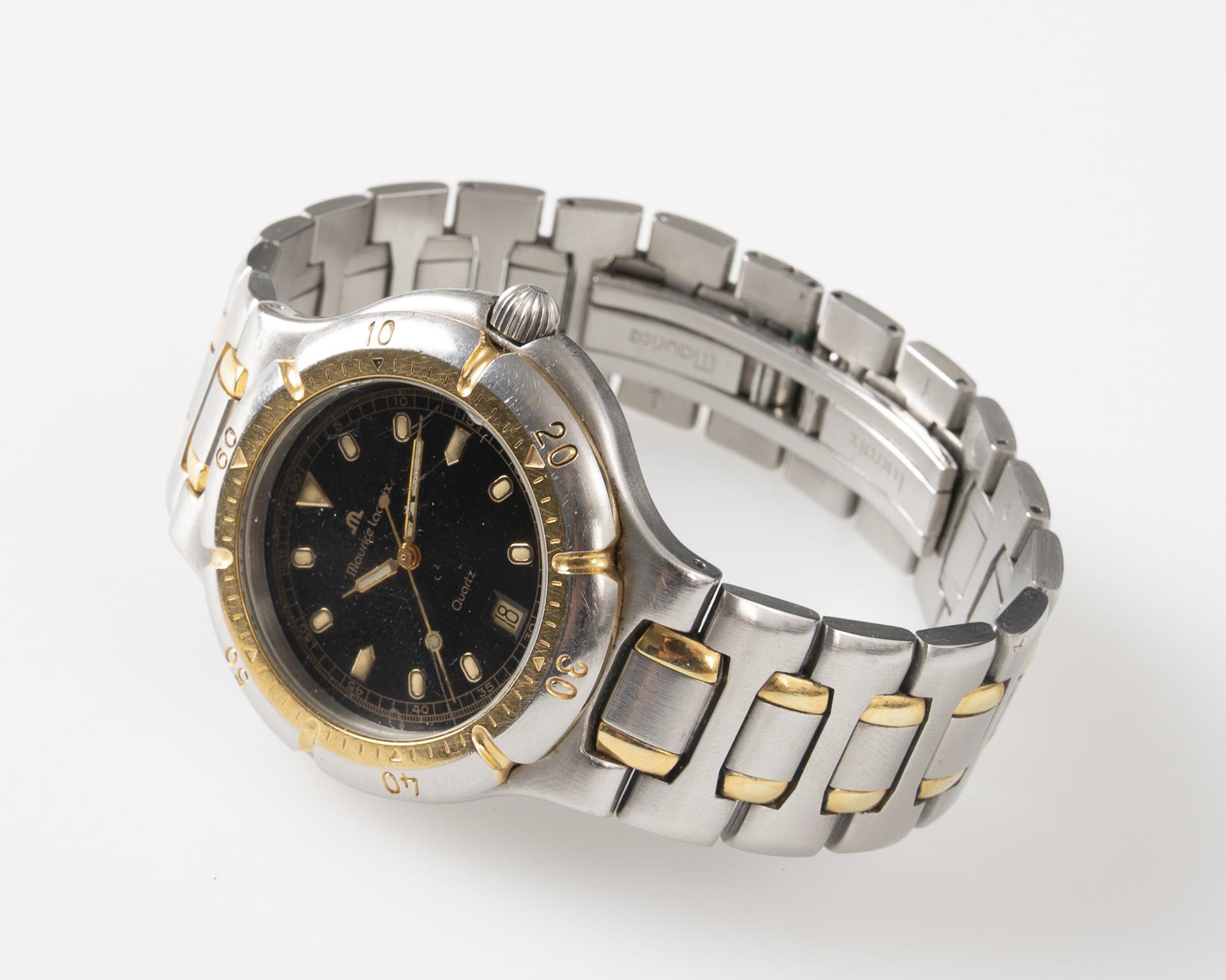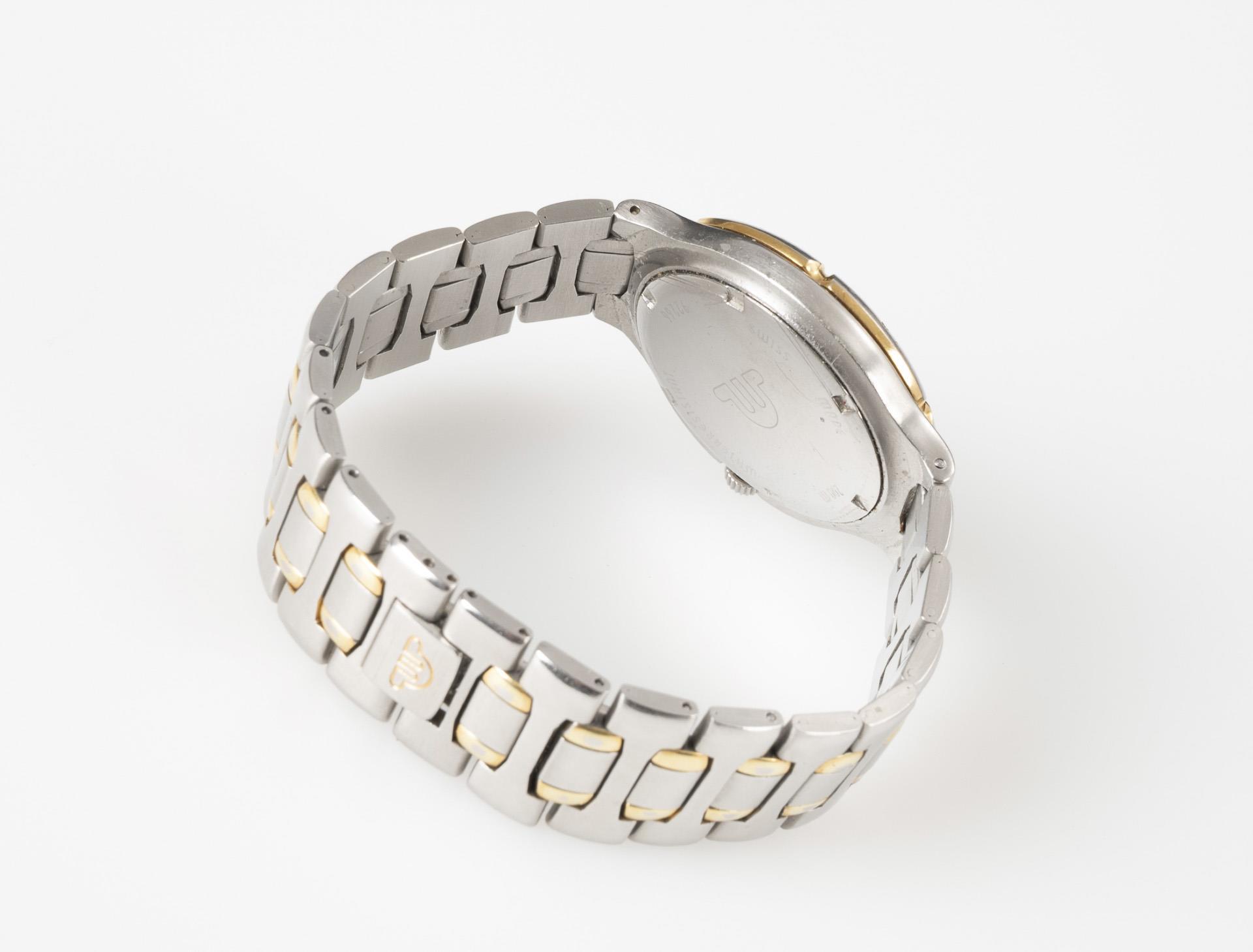Rundes Bicolor-Gehäuse und Prunklünette mit Minutenmarkierung, an schwarzem Gliederband mit Klippverschluss. Glas und Gehäuse mit leichten Gebrauchsspuren und Kratzspuren, Fluoreszenz leicht verblasst.