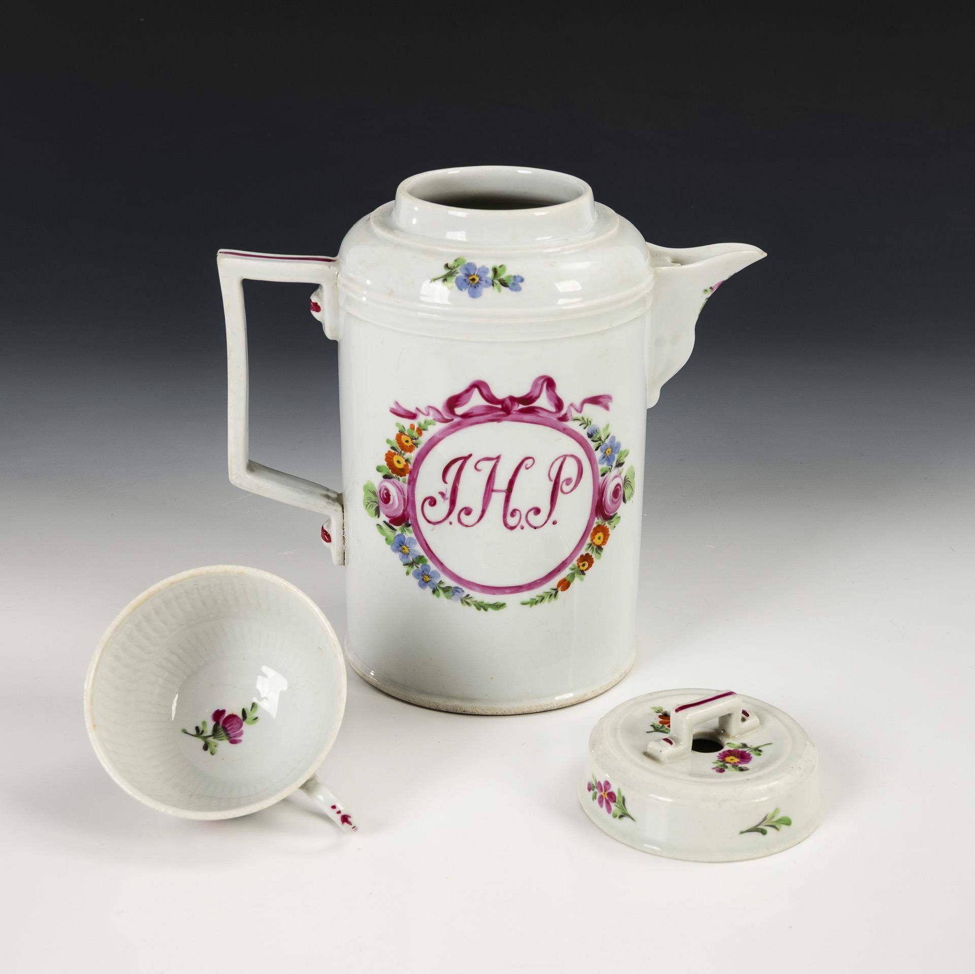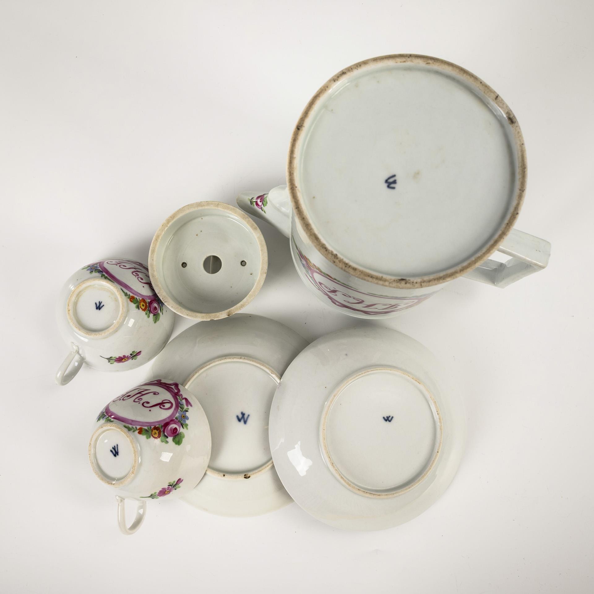 In einem von Rosen und Vergißmeinnicht gerahmten Schleifenmedaillon das Monogramm "J. H. P.". Zylinderkanne mit gewinkeltem Henkel und Knaufdeckel (H 19 cm). / 2x Modell "Gebrochener Stab": 2 Tassen (H 4,5 cm) mit 2 Untertassen (Ø ca. 13 cm). 2 Bestoßungen am Kannendeckel.