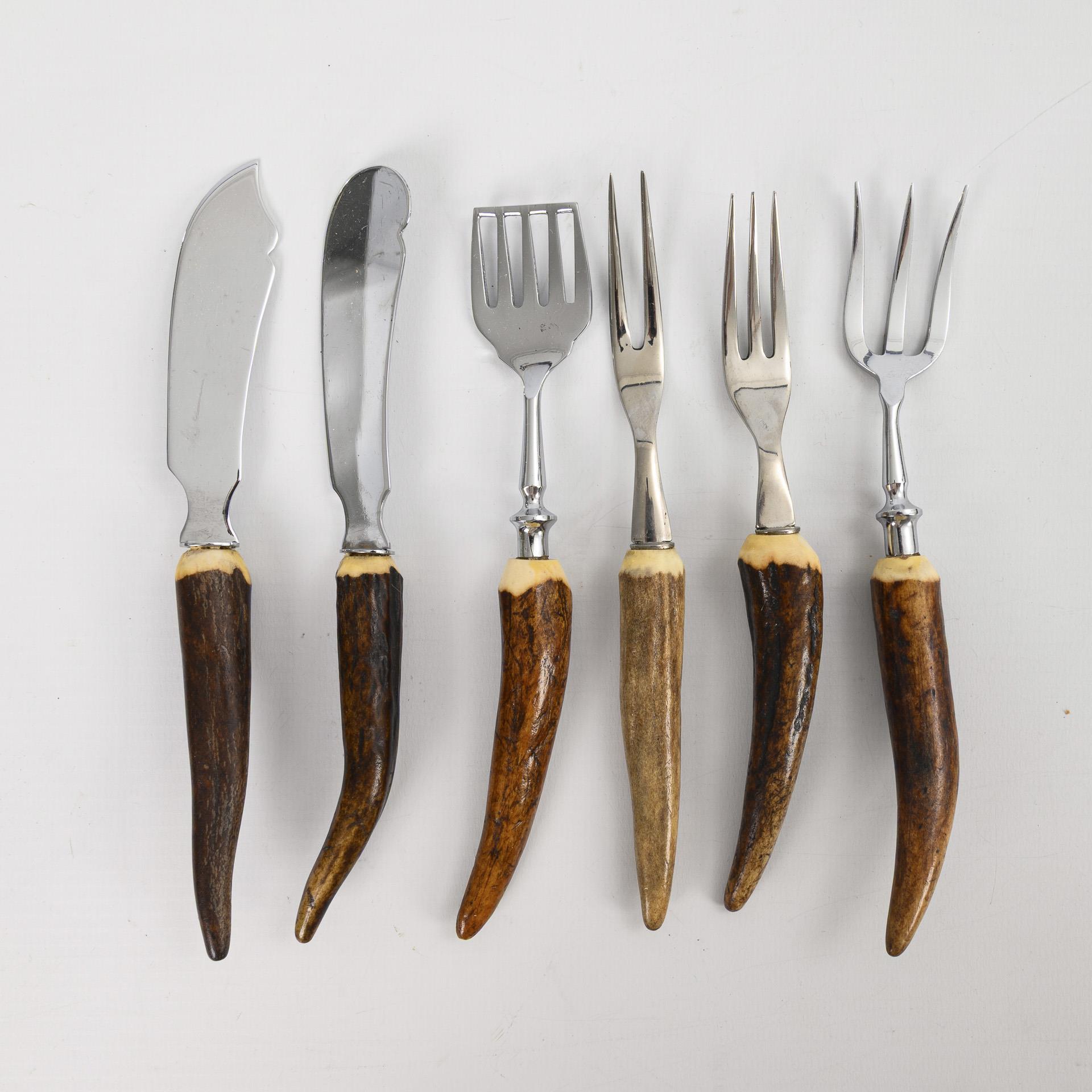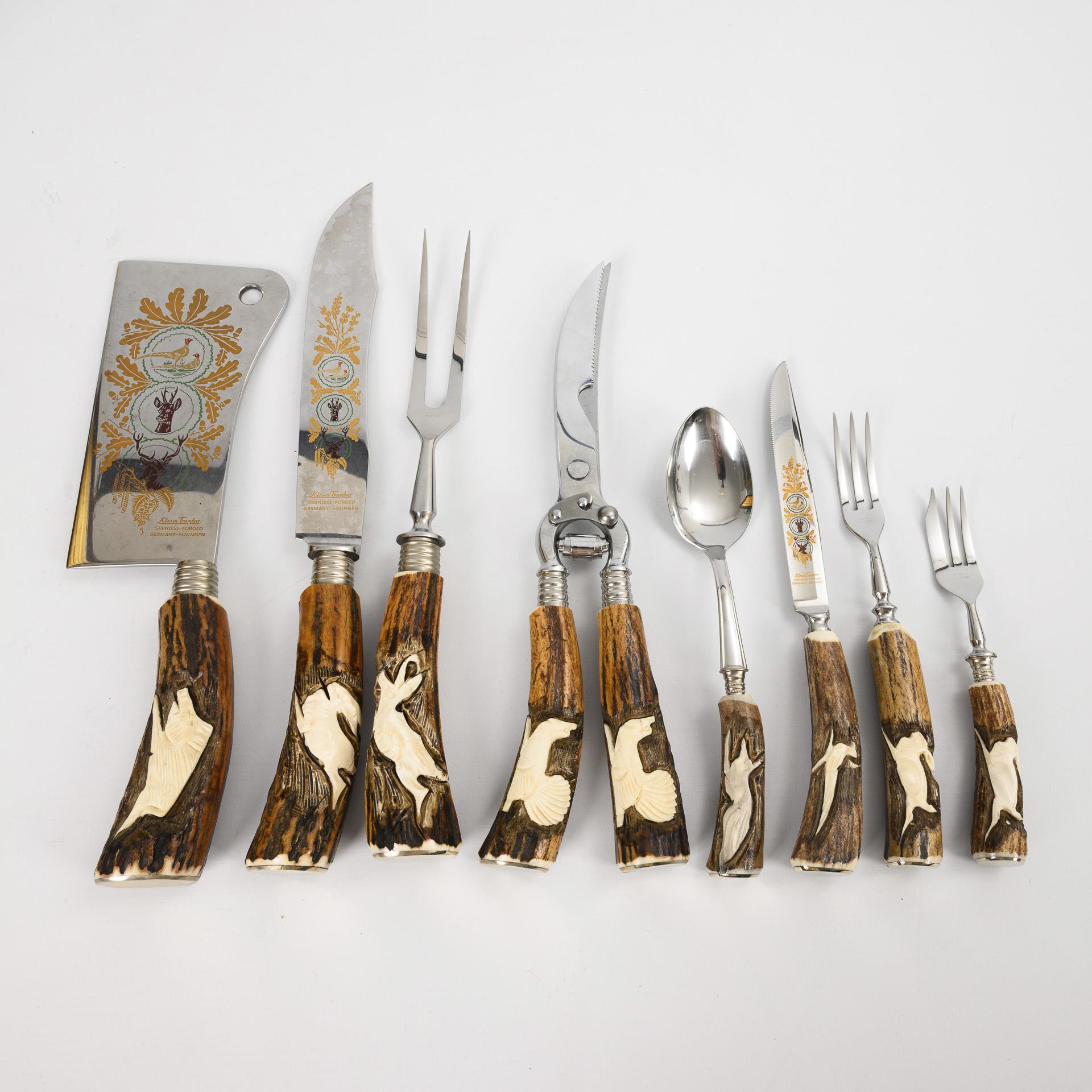 4 ähnliche Schatullen in Lederoptik mit gleich gearbeitetem Besteck; hier alle Geweihgriffe mit verschiedenen Tiermotiven beschnitzt sowie alle Messer einseitig mit dem gleichen, mehrfarbigen Ätzmotiv verziert und gemarkt: 1 Fleischbeil, 1 Geflügelschere, 1 Tranchierbesteck, 14 Speisemesser, 13 Speisegabeln, 14 Speiselöffel, 14 Kuchengabeln. / Dazu 1 graue Schatulle mit 6 kleinen Besteckteilen (Butter- und Käsemesser, Fischheber, 3 verschiedene Gabeln), jedoch unbeschnitzte Geweihgriffe. Geringe Alters-/Gebrauchsspuren an den Schatullen.