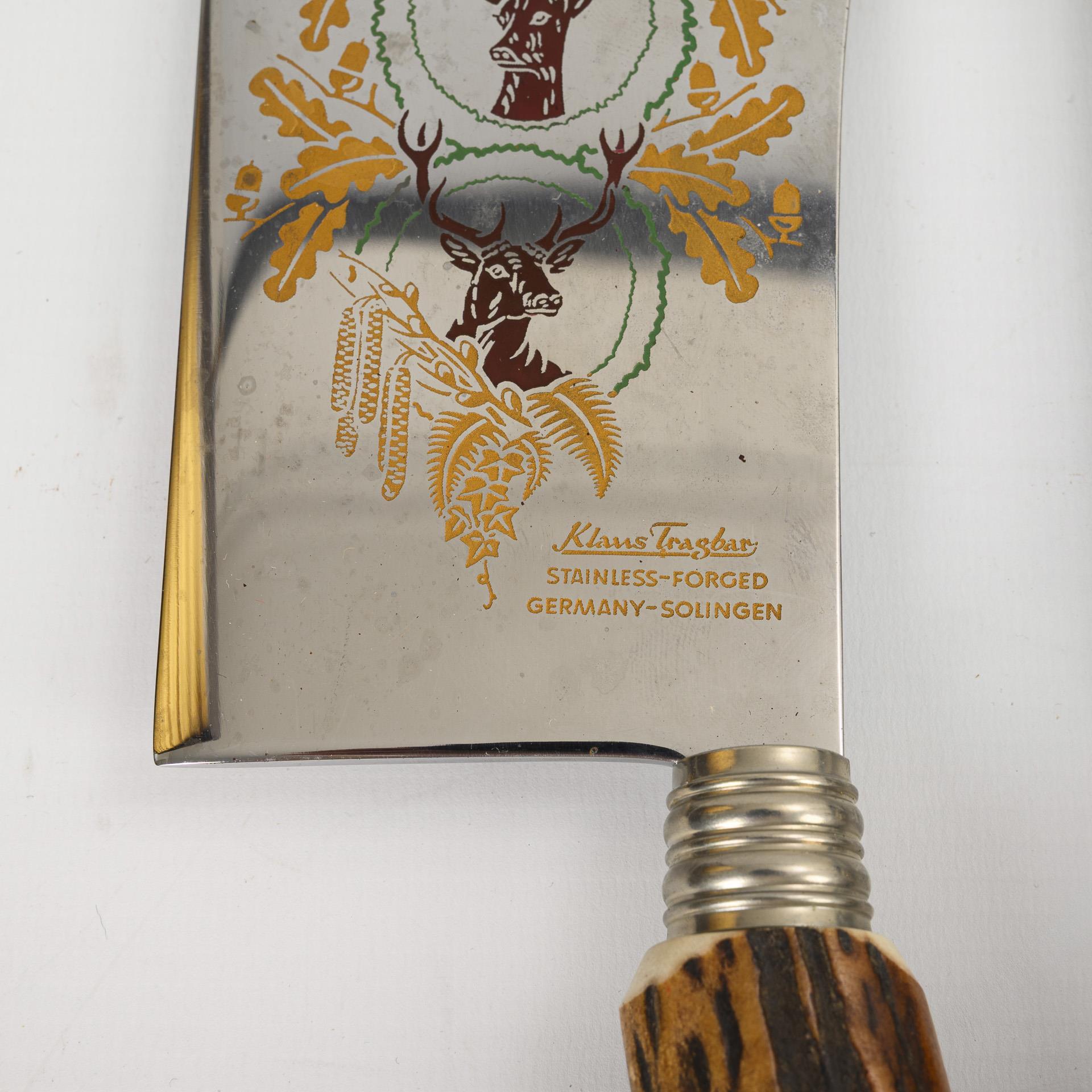 Sehr umfangreiches, dekoratives Jagdbesteck in 5 Schatullen. Klaus Tragbar, Solingen.